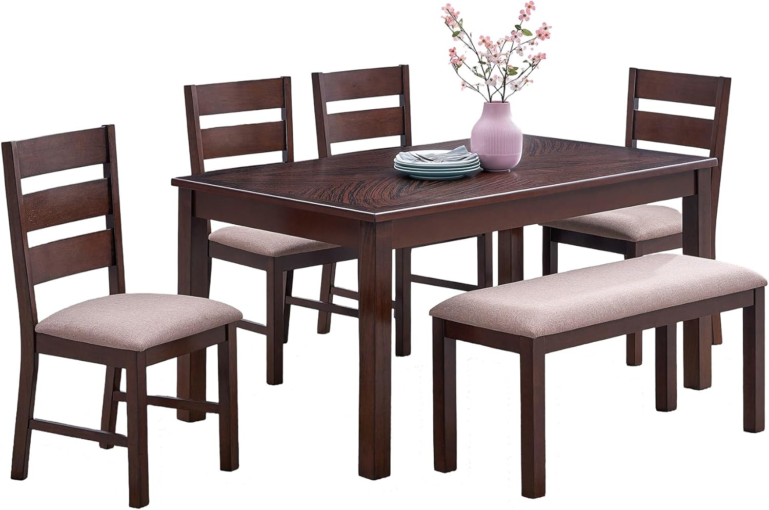 Contemporary Antique Cherry 6pc Dining Set Table and 4X Side Chairs 1x Bench Melamine Table Top Fabric Cushion Seats Chairs Solid wood Dining Room Furniture