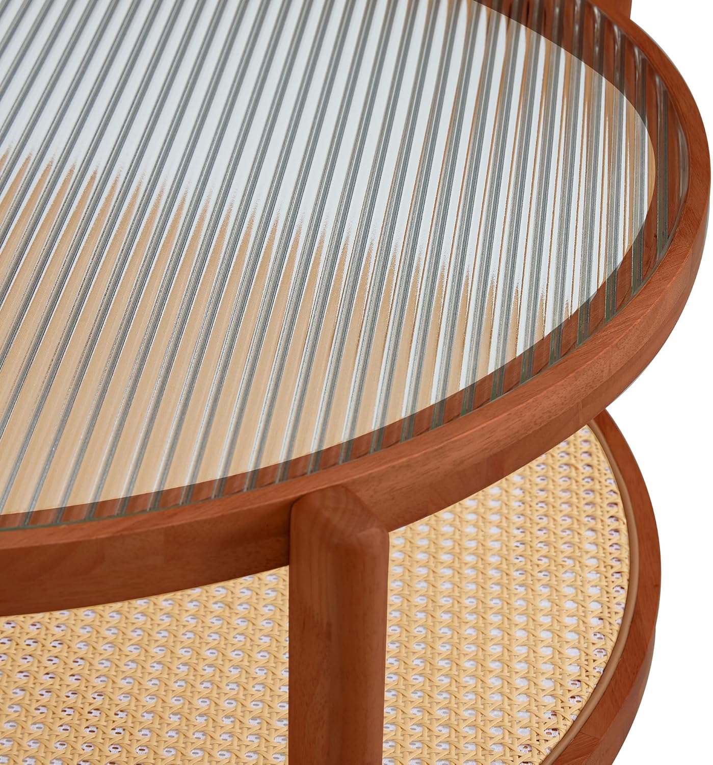 Modern minimalist circular double-layer solid wood coffee table, craft glass tabletop, second layer material: PE rattan, solid wood frame. 34.6 '* 34.6' * 17.7''