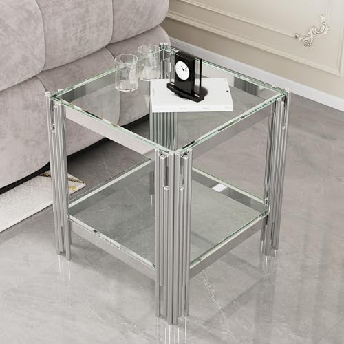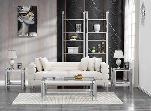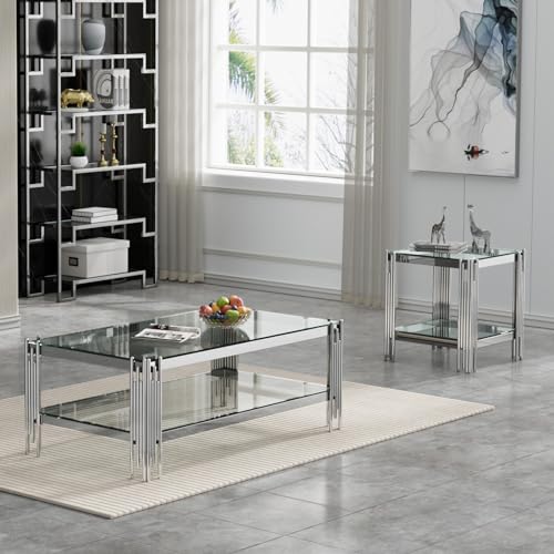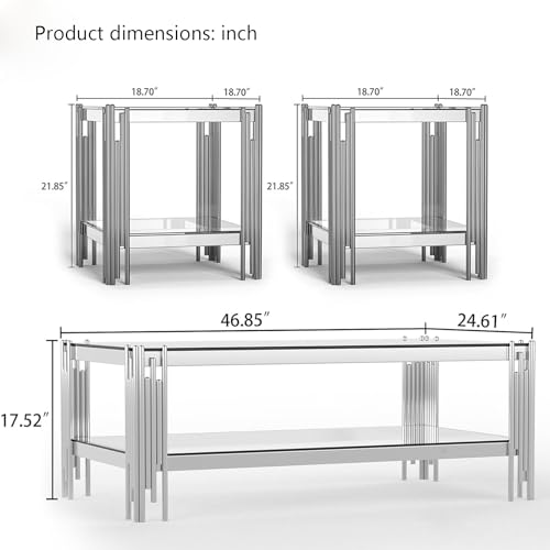 3 Pieces Glass Living Room Table Set, Glass Coffee Table with 2 End Side Table, Modern Glass Coffee Table Set with Silver Stainless Steel Frame for Apartment Living Room Home Office