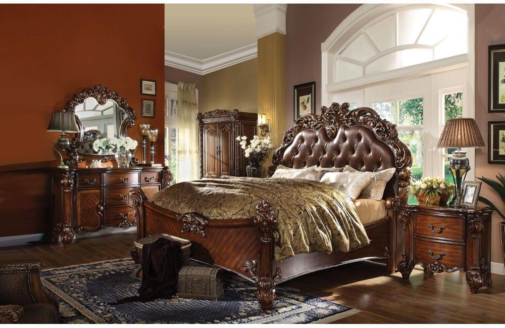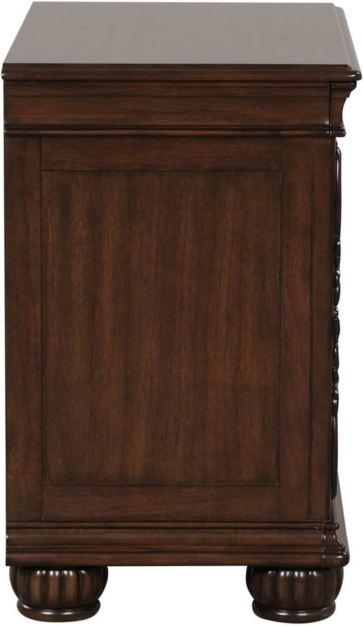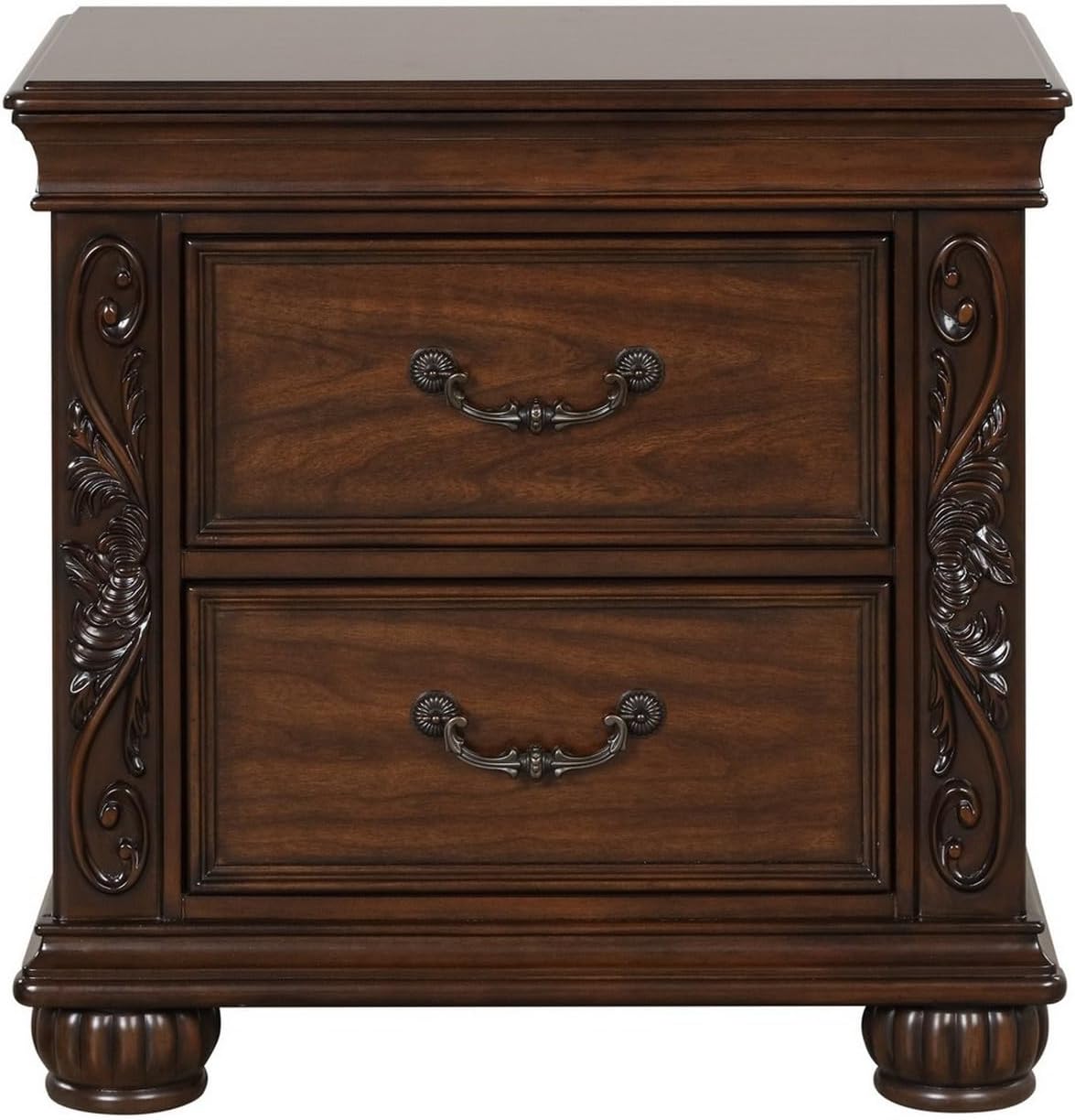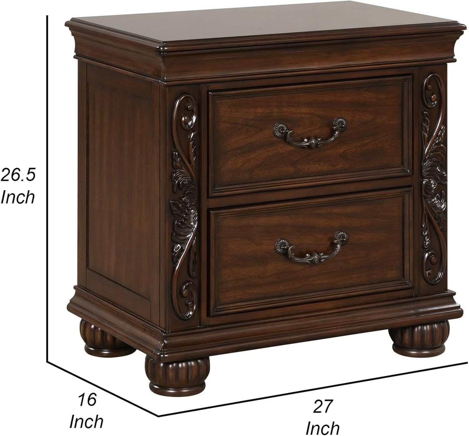 Benjara BM309533 27 in. Akil 2-Drawers Floral Carved Classic Wood Nightstand Cherry Brown