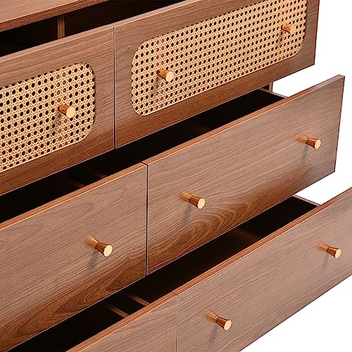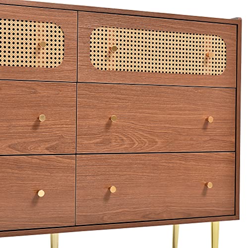 Dresser for Bedroom, Chest of Drawers, 6 Drawer Dresser, Floor Storage Drawer Cabinet for Home Office, Drawer Chest of Drawers Rattan Chest of Drawers Highboard with 6 Drawers (Natural Cherry)