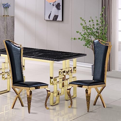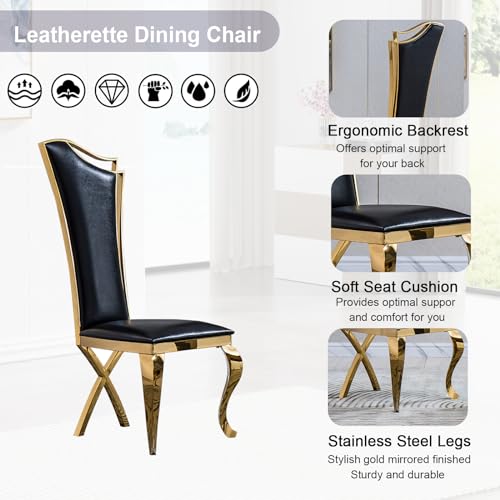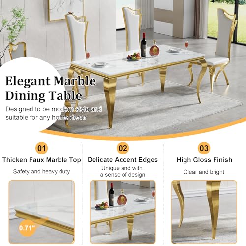 Dining Table Set for 8, Modern Dining Room Table Set for 8, 70" Marble Dining Table with High Backrest Leather Chairs, 9 Piece Marble Dining Table Set, Kitchen Table Chairs Set of 8, Black & Gold