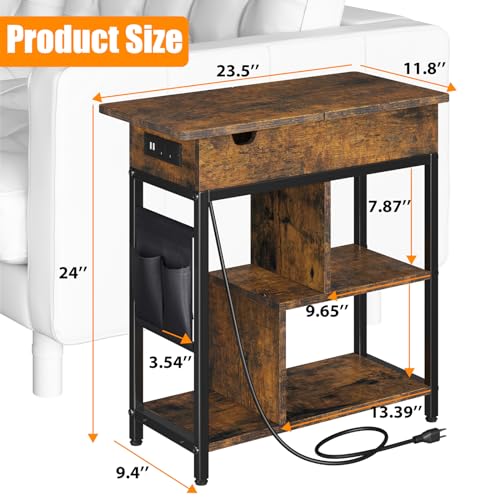 GAOMON End Table with Charging Station, Flip Top Narrow Side Table Nightstand with Outlets USB Ports and Storage, Bedside Table with Shelf for Living Room Small Space (Rustic Brown)