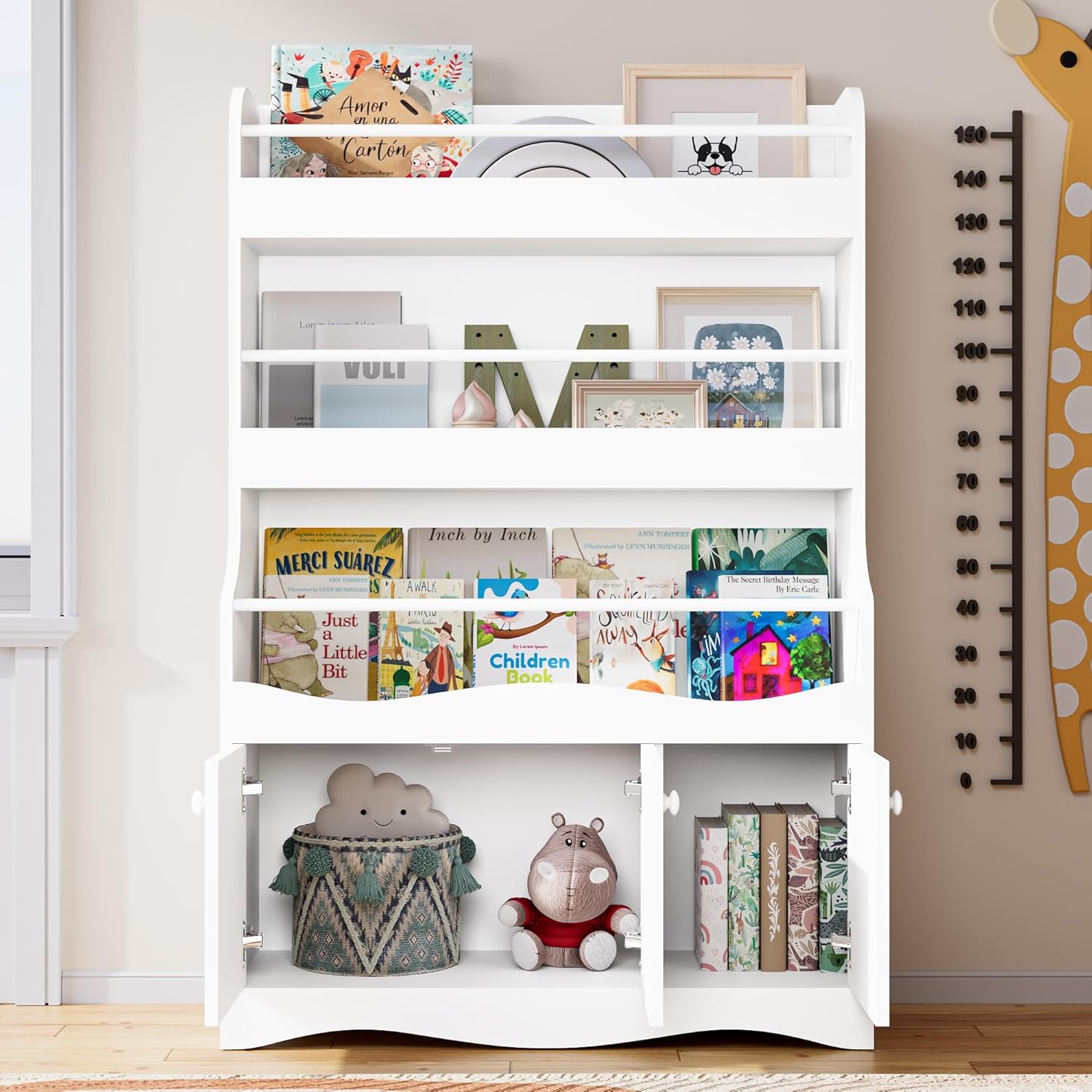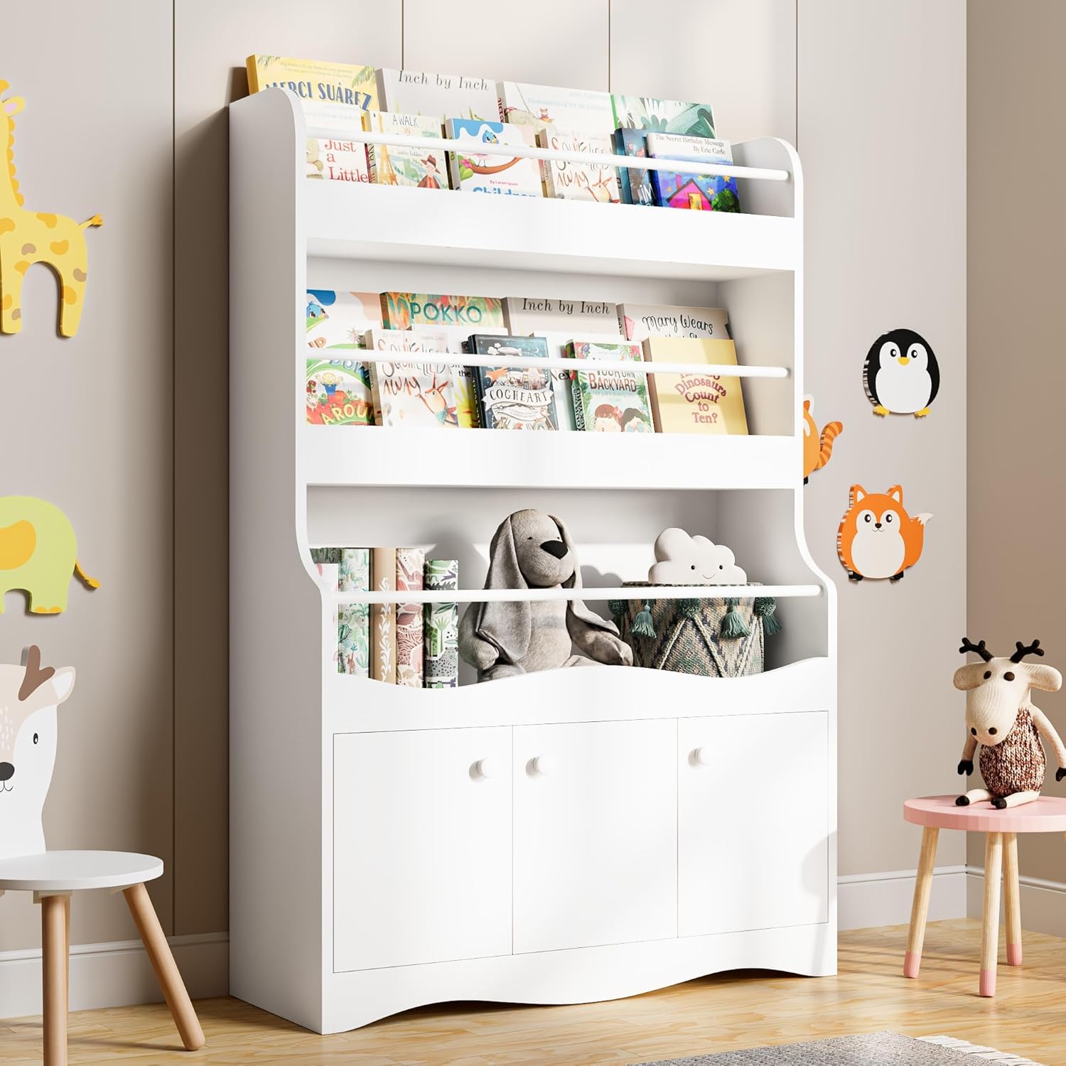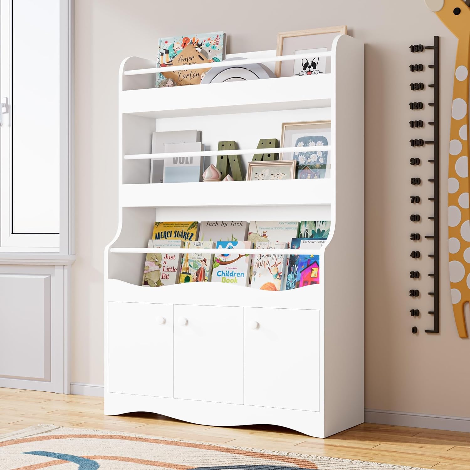 Cozy Castle 3 Tiers Kids Bookshelf, Multifunctional Book and Toy Storage Organizer, Wooden Kids Bookcase with Cabinet for Bedroom, Playroom, Nursery, White