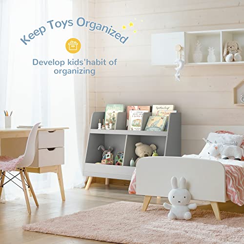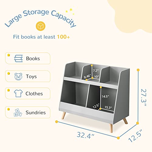 Kids Bookshelf, Baby Book shelf and Toy Organizer, Wooden Open Bookcase with 5 Cubbies, 2-Tier Baby Storage Display, Christmas and Birthday Gifts for Playing Room, Nursery, Natural Wood Color