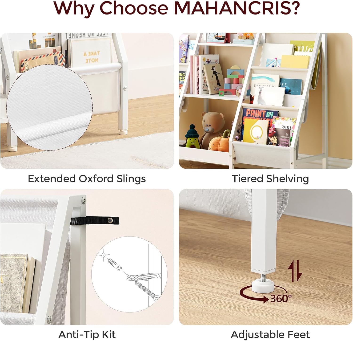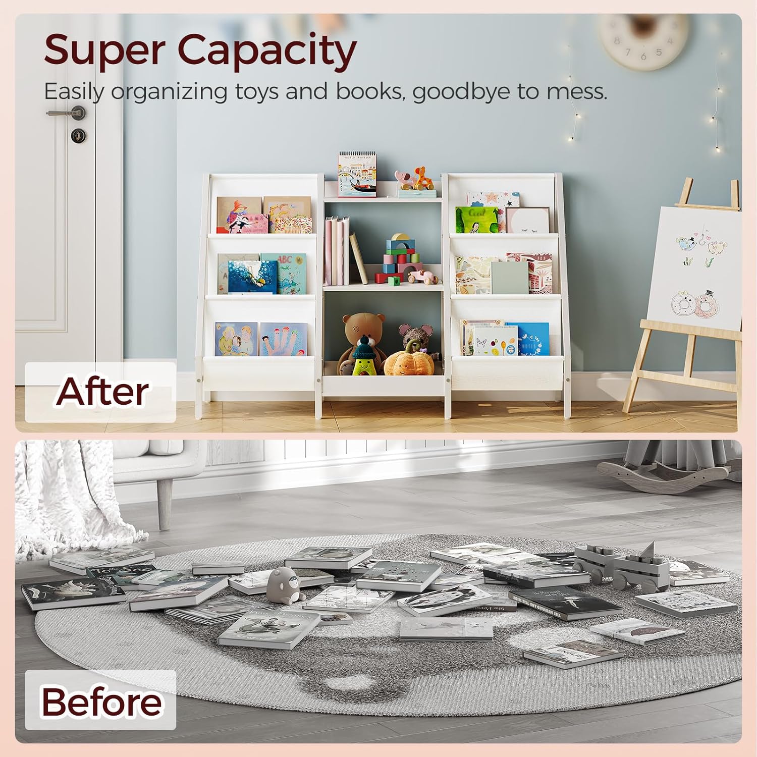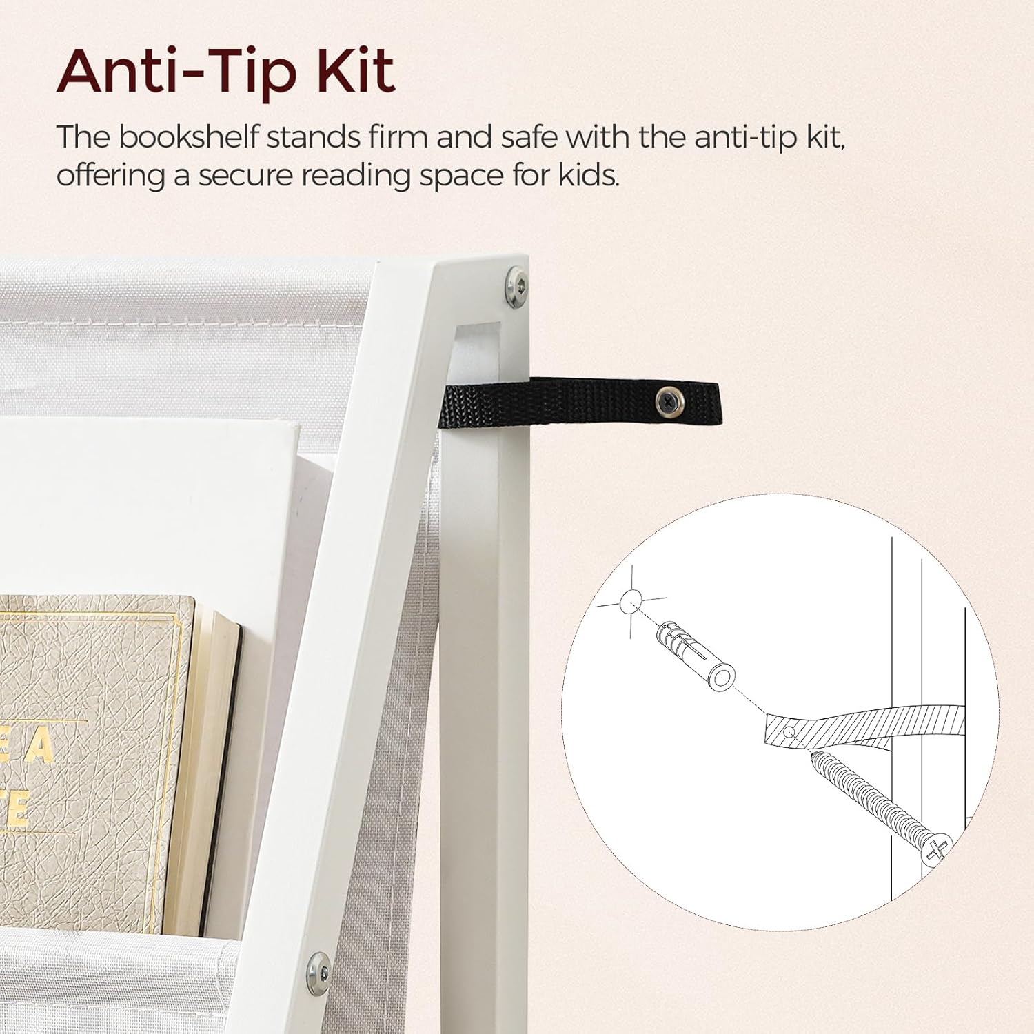 Kids Bookshelf and Toy Organizer, 3-Tier Kids Bookcase, Kids Sling Bookshelf, Toddler Toy Storage Organizer with Bookshelf, for Kids Room, Playroom, Bedroom, Nursery, White BKWT34201