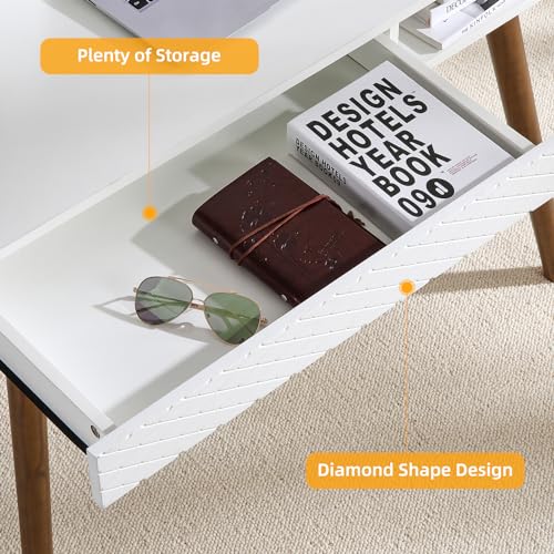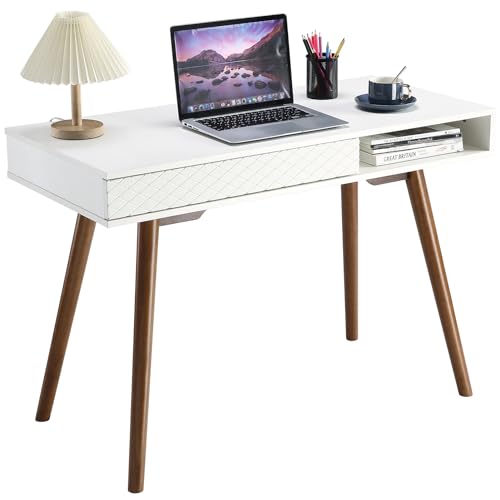 Mid Century Modern Writing Desk, Simple Home Office Desk with Drawer Solid Wood Legs & Open Shelf, Small Vanity Table Desk for Bedroom, Walnut