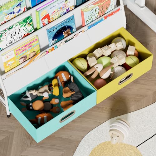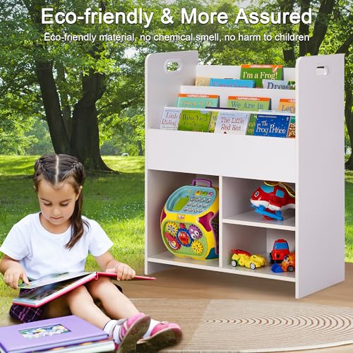 VECELO Kids Bookshelf, 2-in-1 Children sling Bookcase with Shelves and 3 Different Size Cubes, Wooden Toy Storage Cabinet Organizer for Kids Room, Bedroom, Nursery, Kindergarten, White