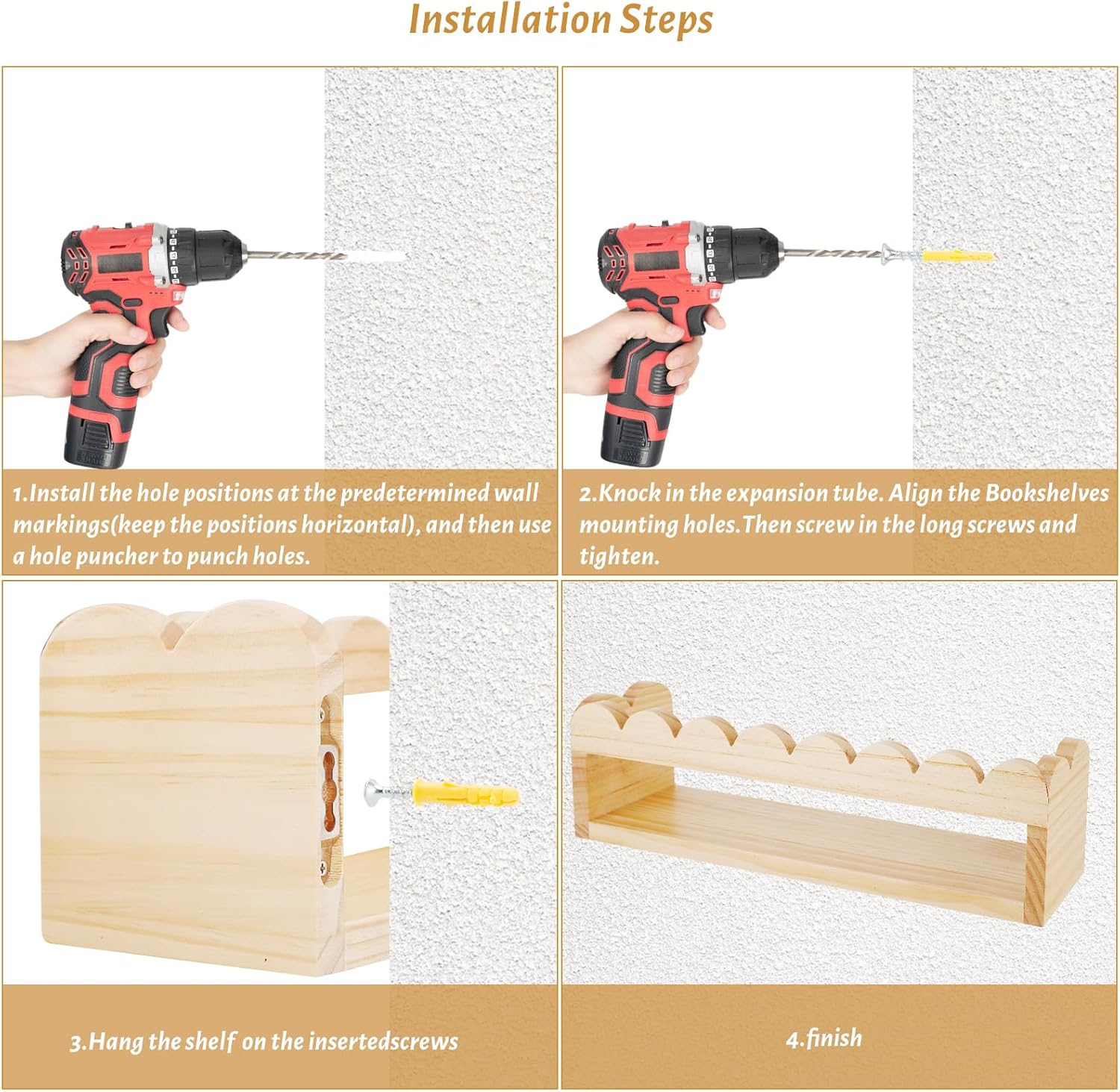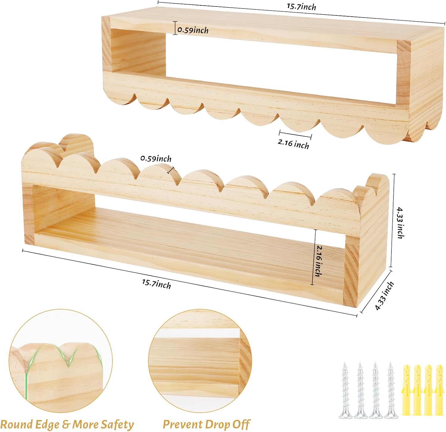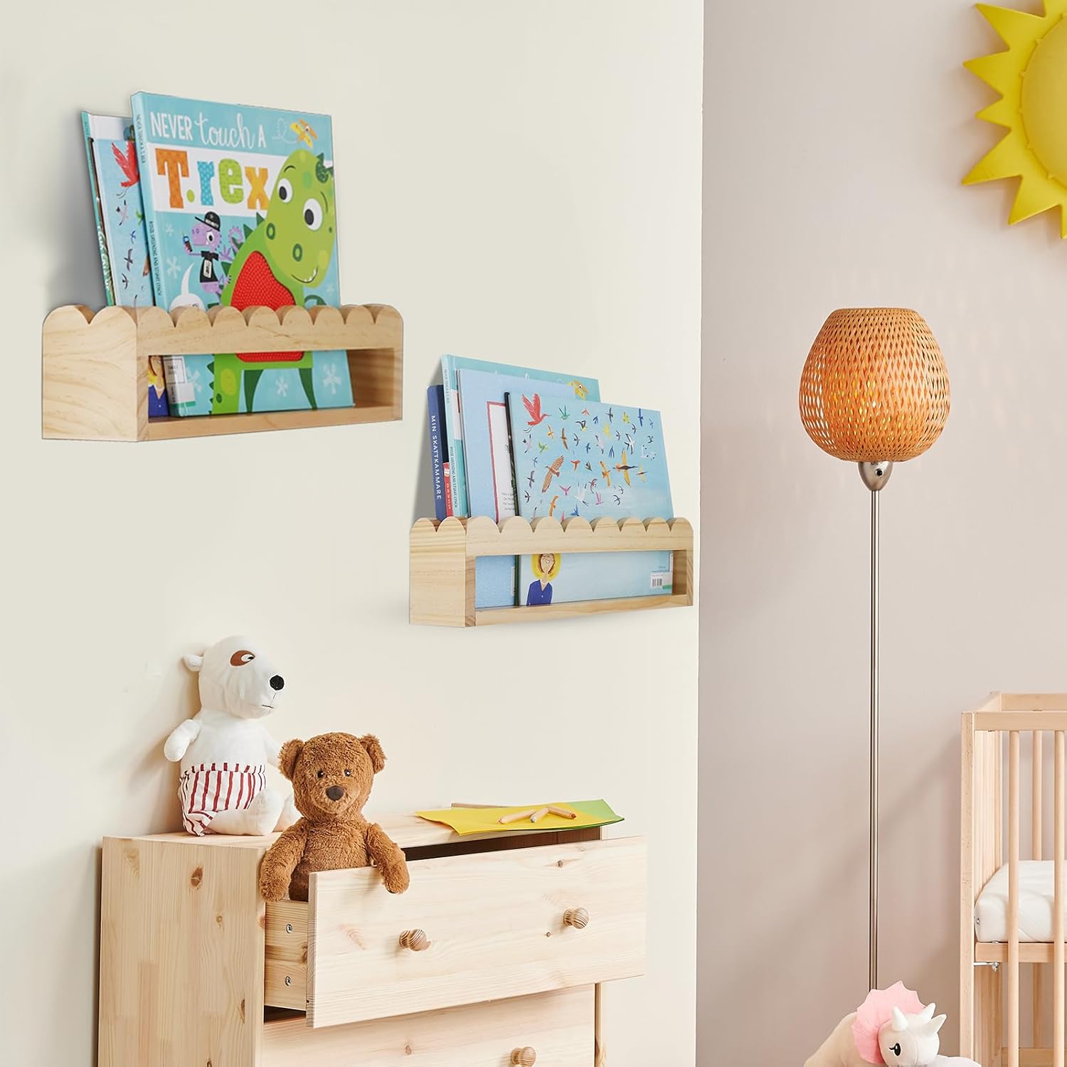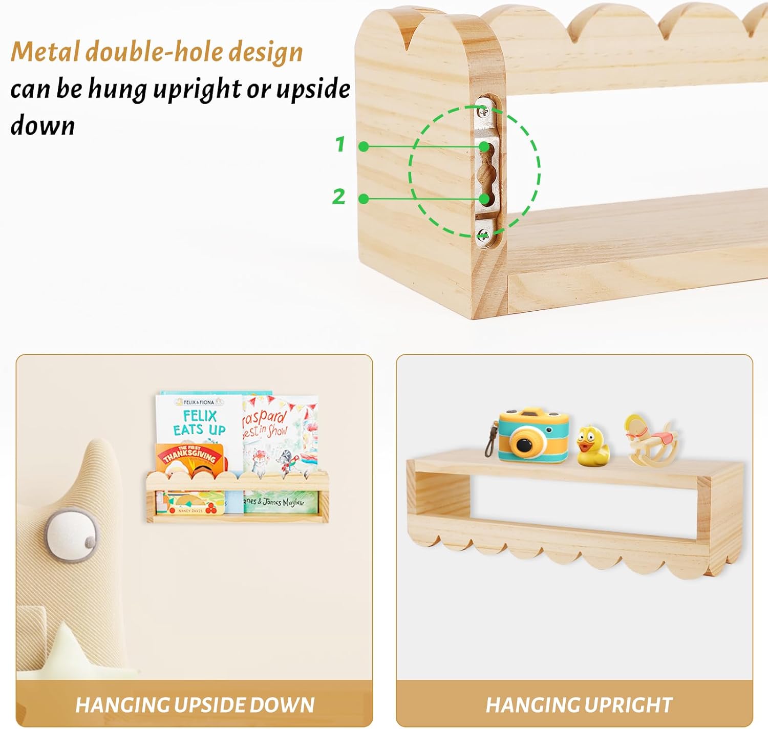 Scalloped Floating Nursery Bookshelves for Wall,Set of 2 Natural Wood Wall Bookshelf for Kids Rooms,Preassembled Baby Bookshelf,Hanging Storage Shelves