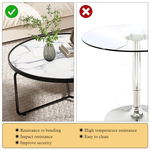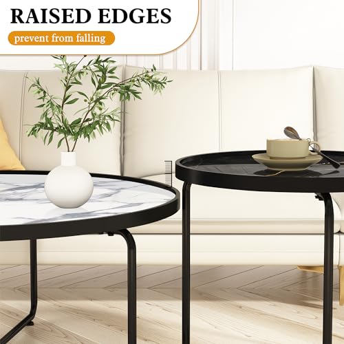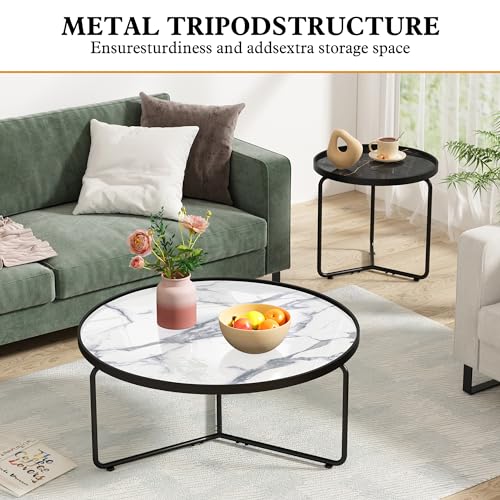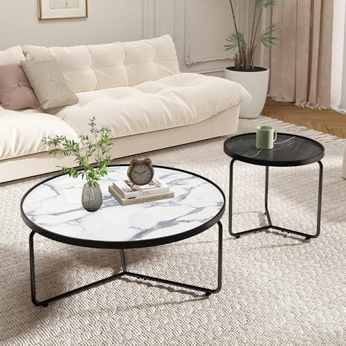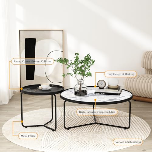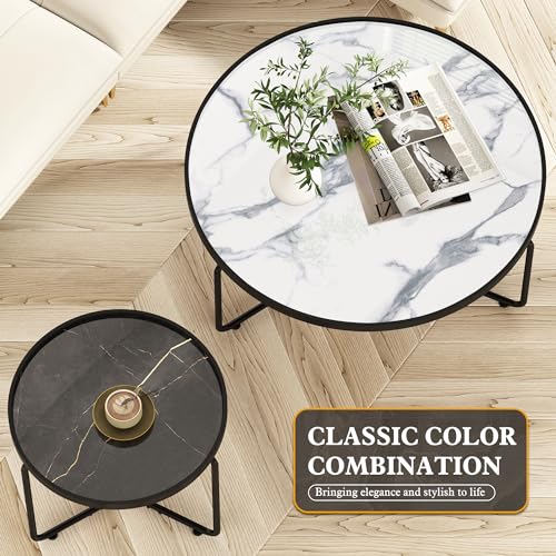 HLR White Round Glass Coffee Table Set of 2,Modern Coffee Table with Sturdy Metal Frame,Cocktail Table with Classic White and Black Faux Marble Tray Top,Nesting Table for Living Room Patio Office