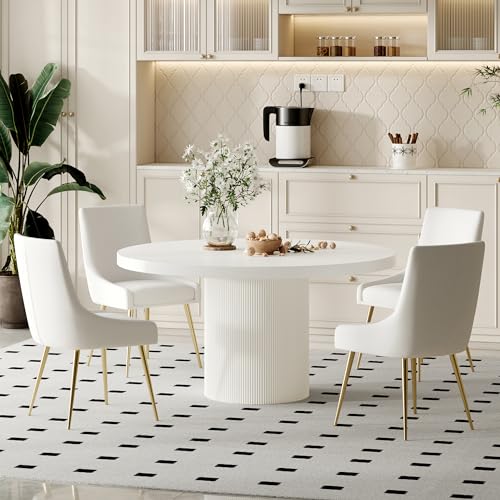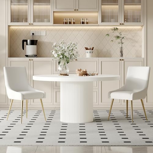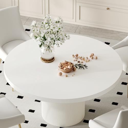 59" White Round Dining Table for 4-6, Modern Kitchen Table with High Gloss MDF Tabletop and Vertical Stripe Pattern Base, Leisure Circular Coffee Table for Living Room Office