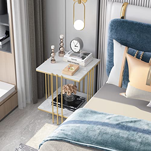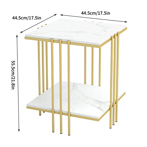 Wisfor Sintered Stone End Table: 2 Tier Square White Sofa Side Table - Small Coffee Table with Golden Frame - Modern Bedside Nightstand for Living Room Bedroom