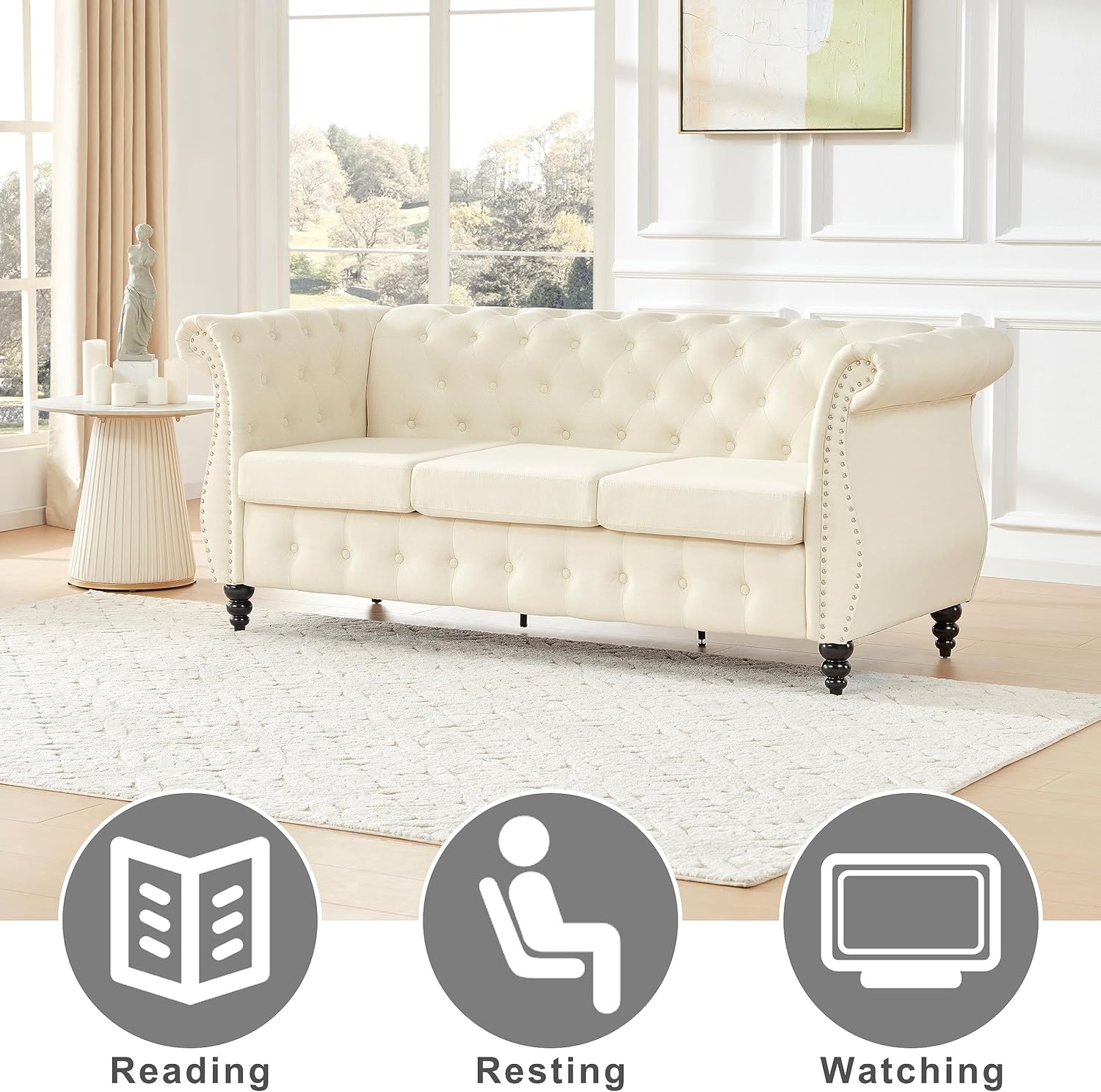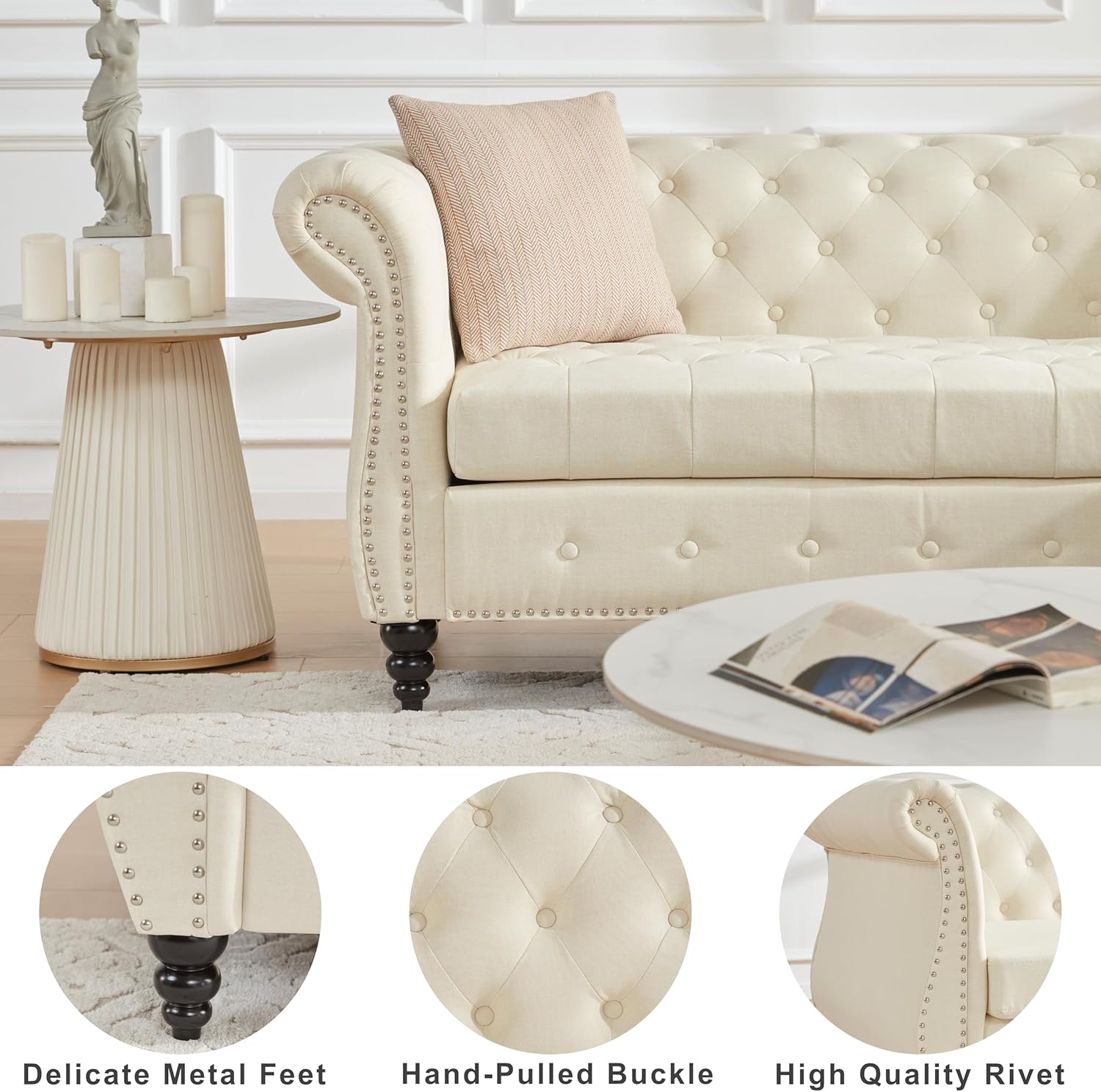 Chesterfield Sofa, Classic Button, Tufted 3, Seater Couch with Rolled Arms & Nailhead Trim Linen Upholstered with Gourd Wooden Legs, Vintage Living Room & Bed, Beige