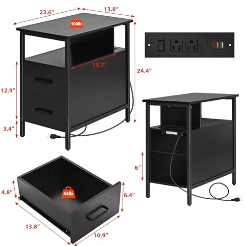 Black Side Tables, End Table with Charging Station, Narrow End Table with 2 Wooden Drawers, USB Ports and Power Outlets, Slim Nightstand and Bedside Table, End Tables Living Room, Bedroom