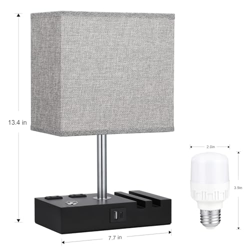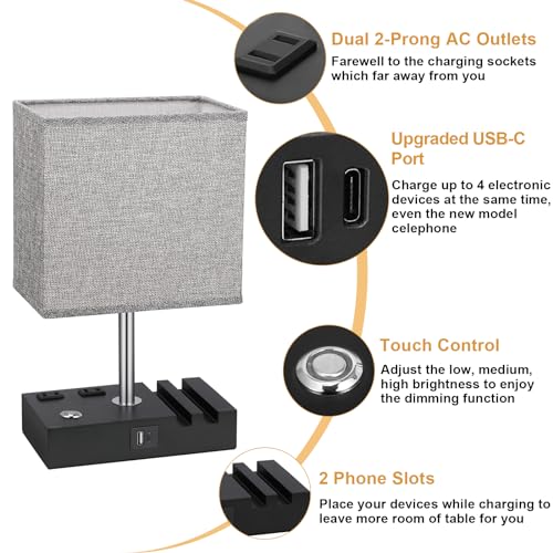 Kakanuo Table Lamp for Bedroom with Dual USB Ports, Beige Fully Dimmable Bedside Lamp with Phone Stands and 2 Charging Outlets, Desk Lamp for Nightstand and Living Room, LED Bulb Included