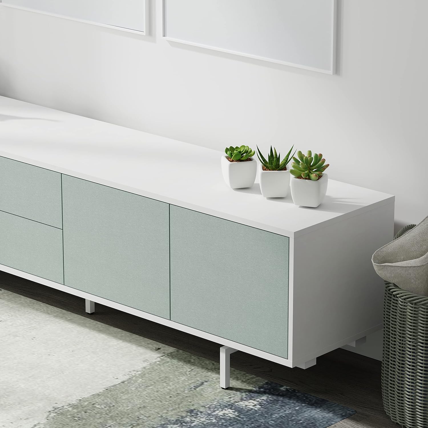 Glenwillow Home Atlas 78" x 20" Modern TV Stand Cabinet - White Frame, Jade Ocean Door/Drawers, White Base