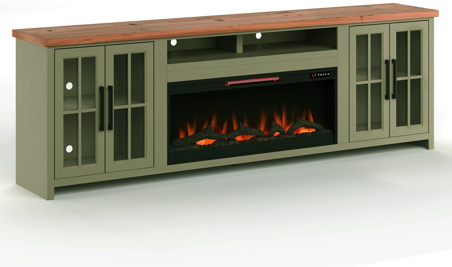 Bridgevine Home Vineyard 97 inch Fireplace TV Stand Console for TVs up to 100 inches, Minimal Assembly, Sage Green and Fruitwood Finish