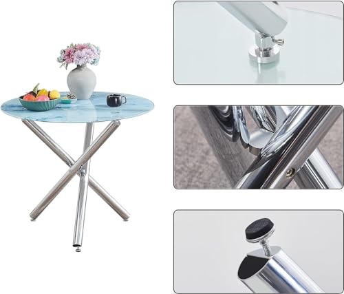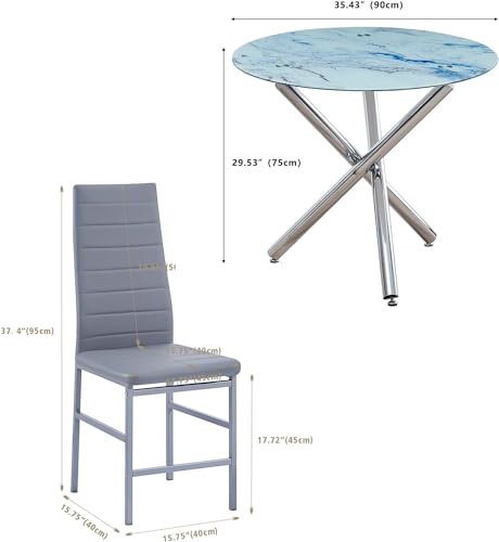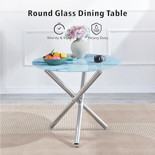 Round Glass Dining Table Set 5 Pieces Dining Table Chair Set for Home Kitchen Round Tripod Chrome Legs Table with 4 PU Chairs, Contemporary Dining Room Furniture Set for Small Space