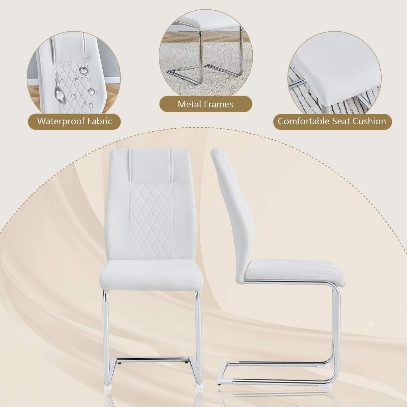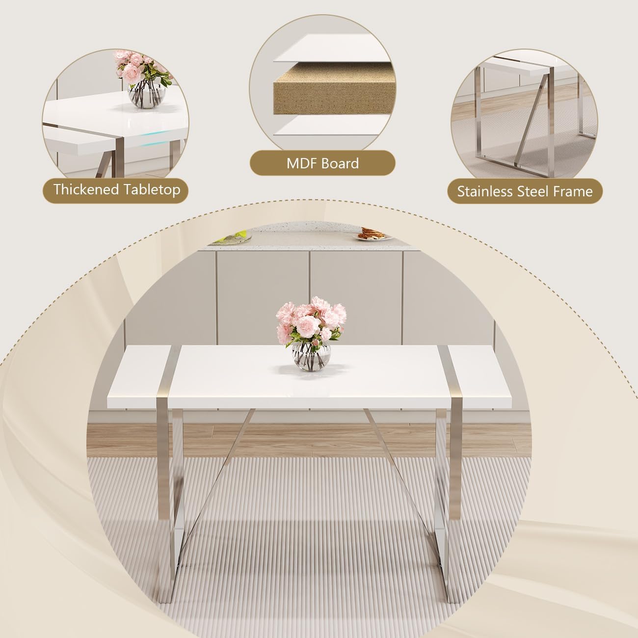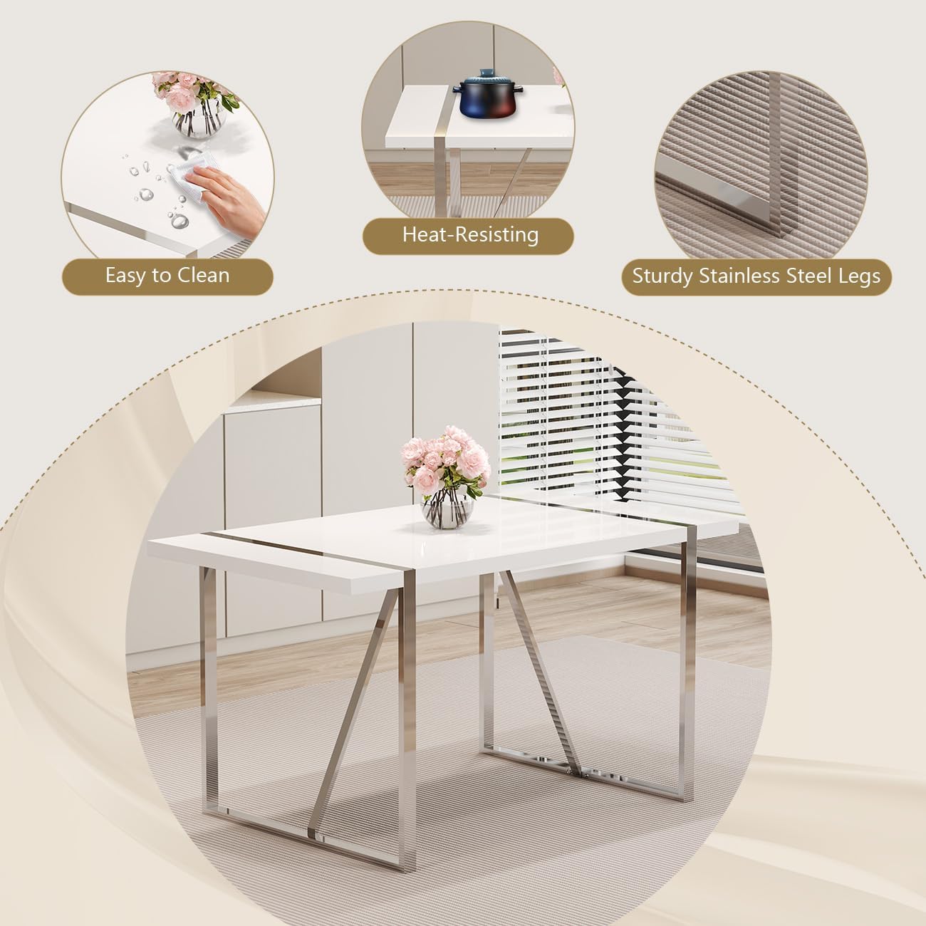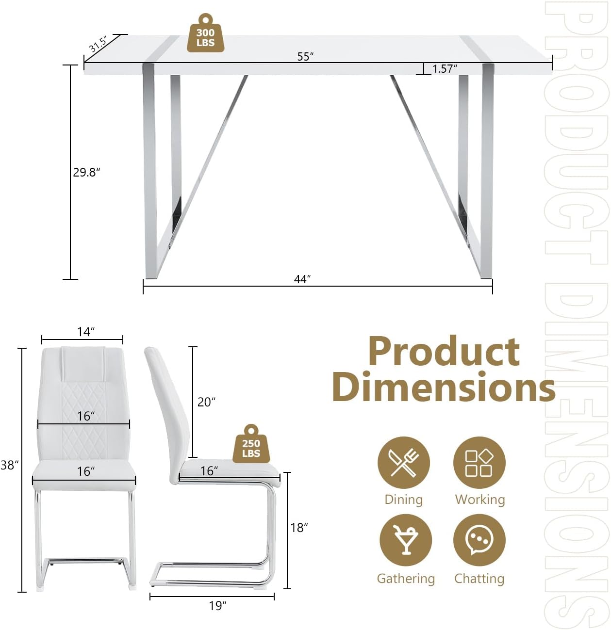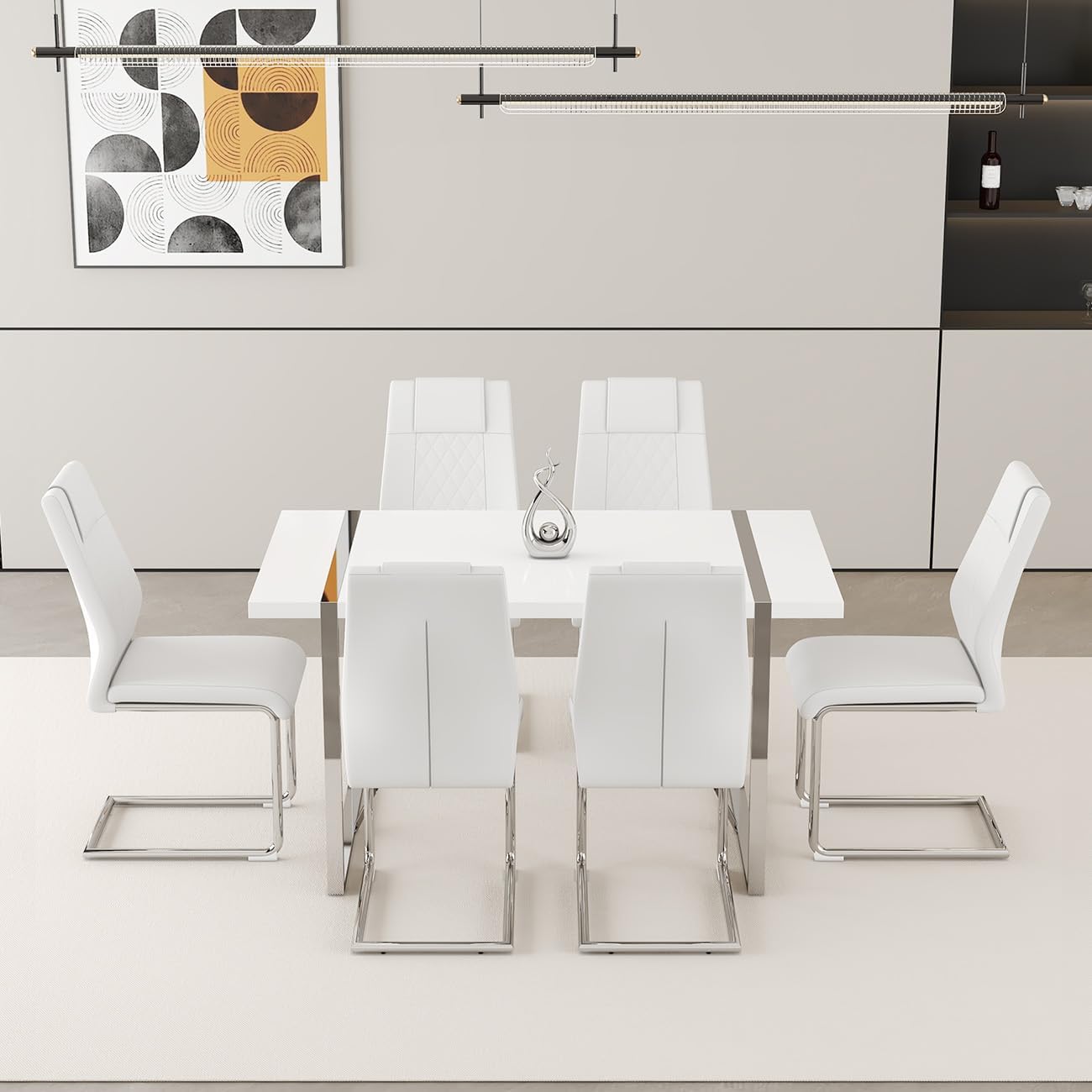 55‘’ Modern Dining Table Set for 6, White Dining Tabletop and Silver Metal Frame, Rectangle Dining Room Table with 6 White Upholstered Dining Chairs. Dinner table Set for Kitchen and Dining Room.