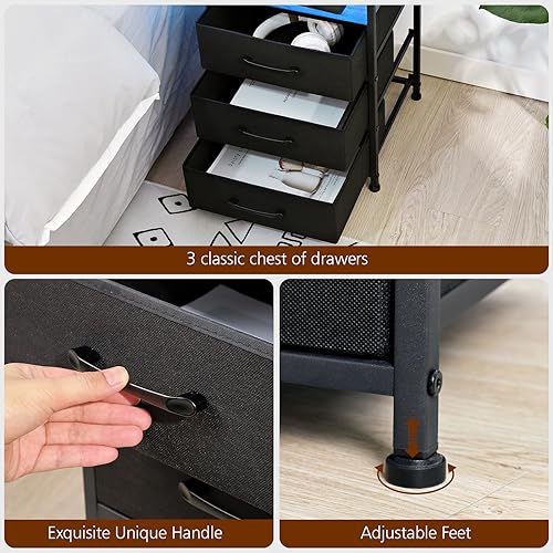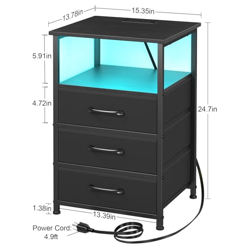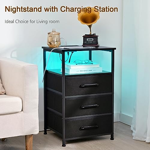 Night Stand Set 2, LED Nightstand with Charging Station, End Tables with Storage Shelf for Living Room, Bed Side Table with 3 Fabric Drawers for Bedroom HNS013GY