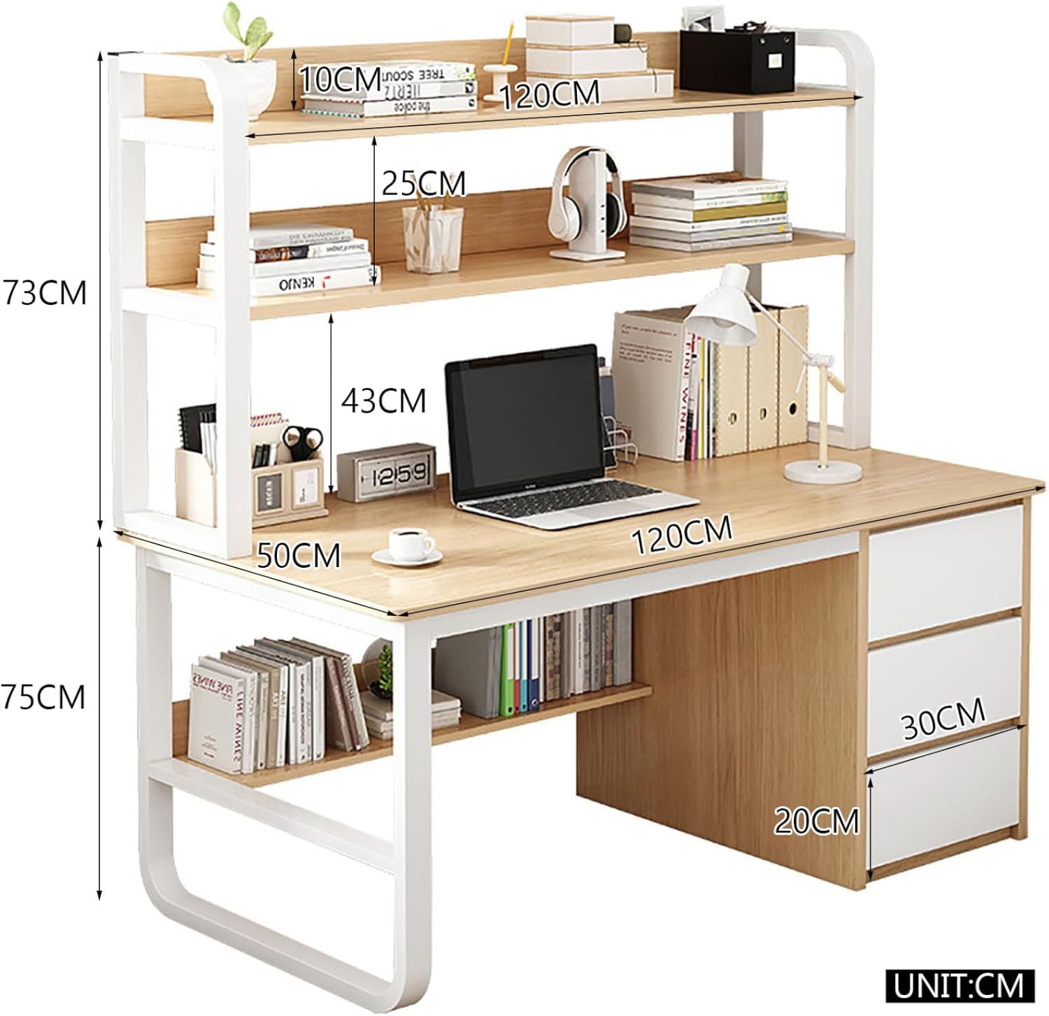 Computer Desk with 3 Drawers and Storage Shelves, Modern Writing Desk Study Table Laptop Workstation for Home Office(120cm, White)