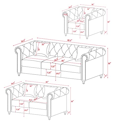 Yoglad Modern Velvet 3-Piece Sofas, Sectional Couch with White Villose Pillow, Couch with Mirrored Side Trim, Faux Diamonds Decor, Free-Combination Couches for Living Room (Red, 1+2+3 Seat, Velvet)