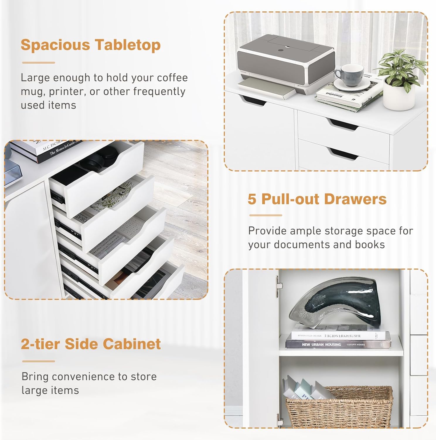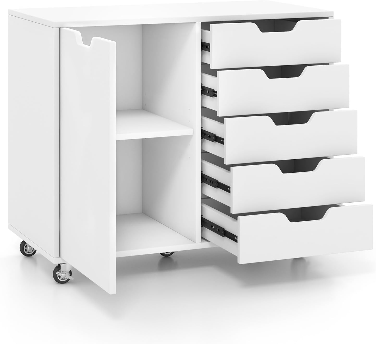 Modern File Cabinet, White Lateral Filing Cabinet 5 Drawer with Universal Wheels, Wood Printer Stand with Storage, Rolling File Cabinets for Home Office, Living Dining Room, Bedroom, Kitchen