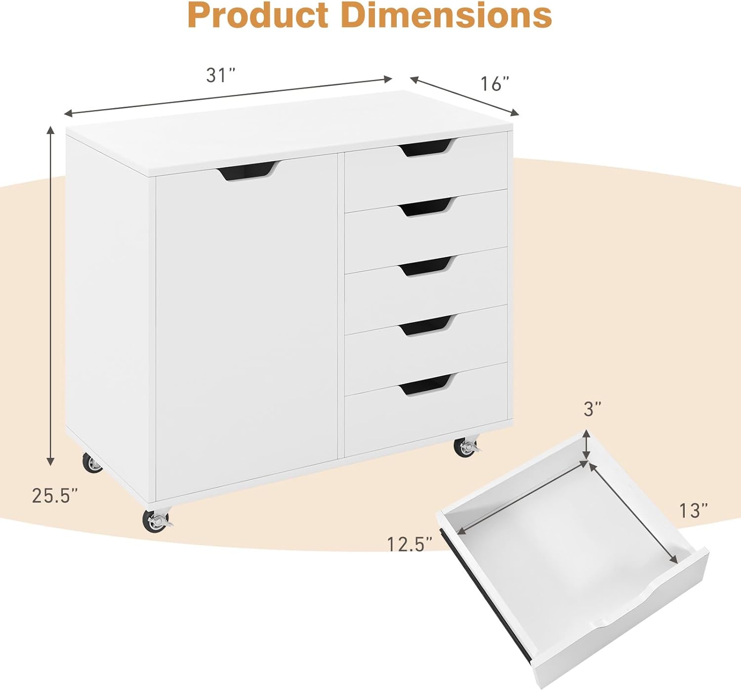 Drawers Cabinet Mobile Filing Organizer with 5 Drawers and Wheels Mobile Side Cabinet Chest, Office Organization and Storage, Bedroom Furniture