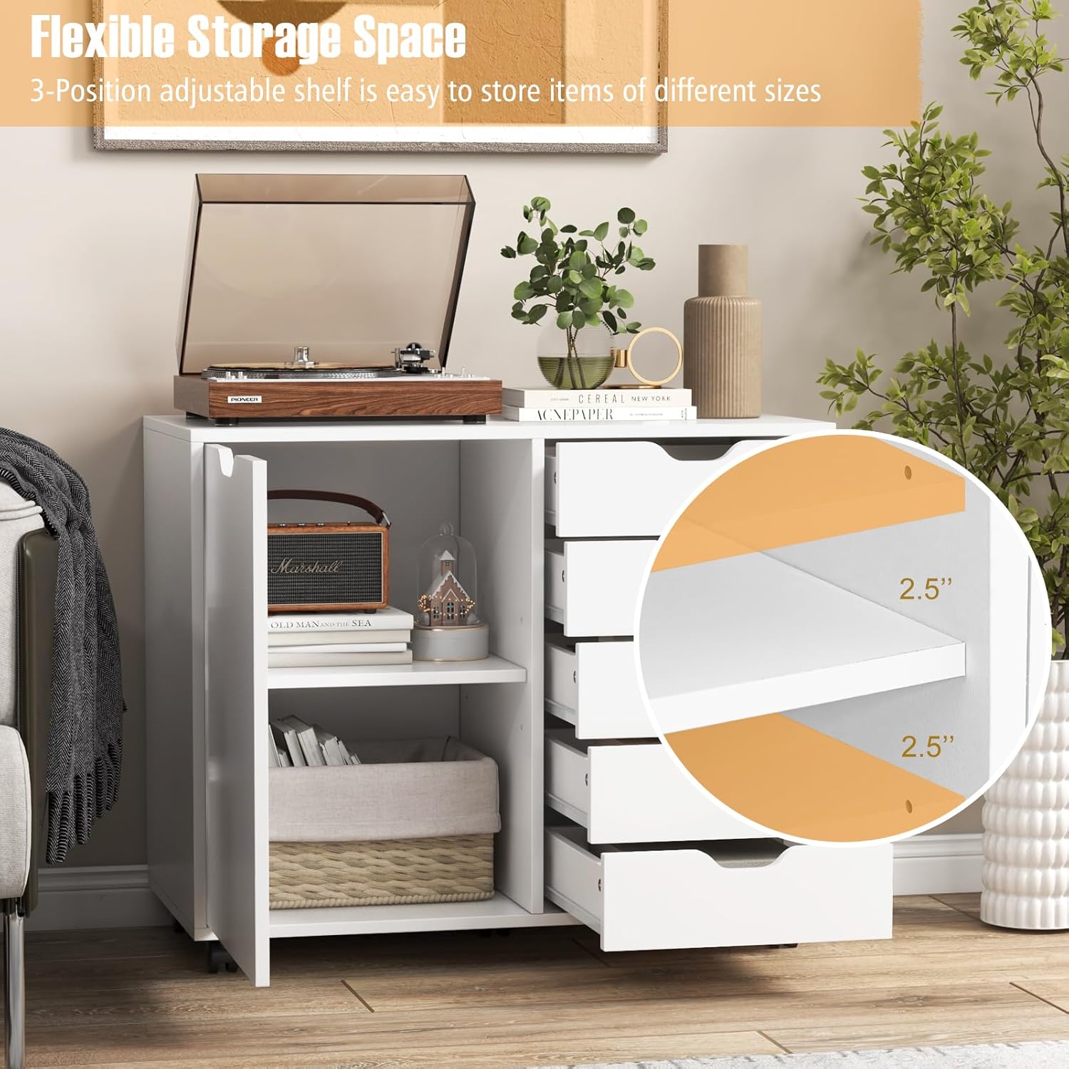 File Cabinet with 5 Drawers Printer Stand Wooden Storage Cabinet with Wheels Mobile Organizer Drawer Cabinet Display Decoration Cabinet Suitable for Home and Office (White)
