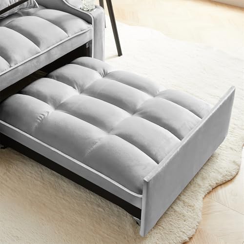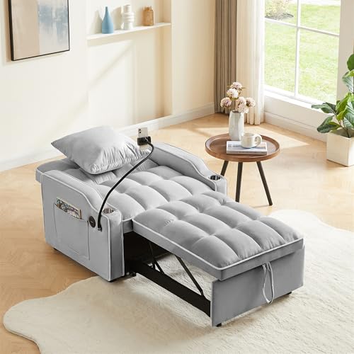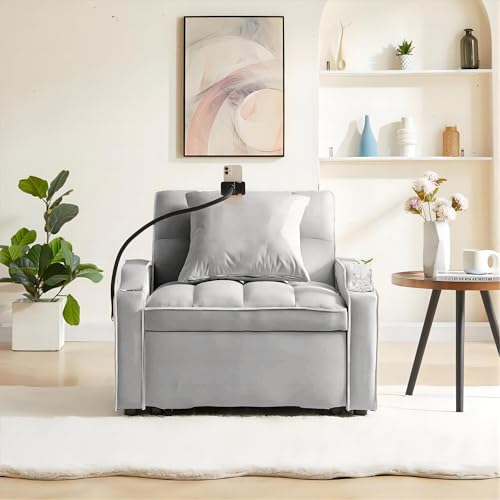 GERRIT Velvet Convertible Sleeper Sofa Chair Bed, 3 in 1 Multi-Functional Lounge Chair Sleeper, Pull Out Couch Guest Bed with USB Port & Cup Holder for RV, Living Room, Small Spaces (Grey)