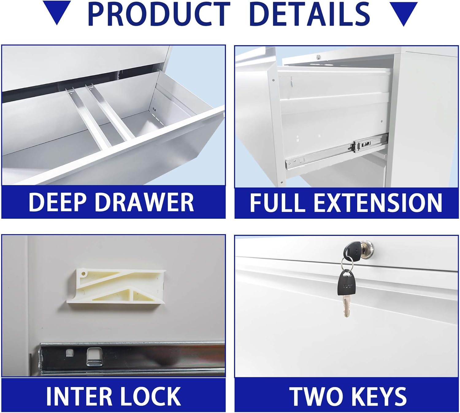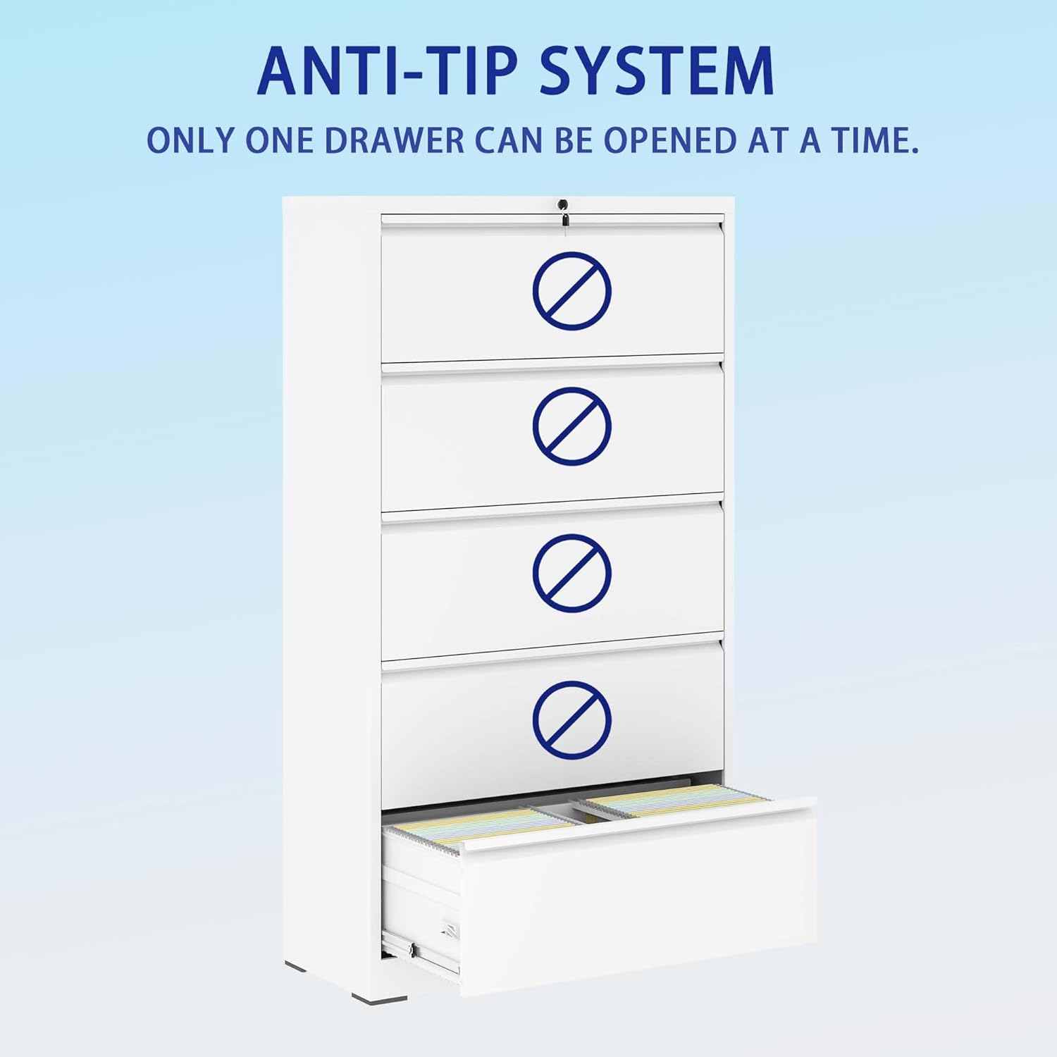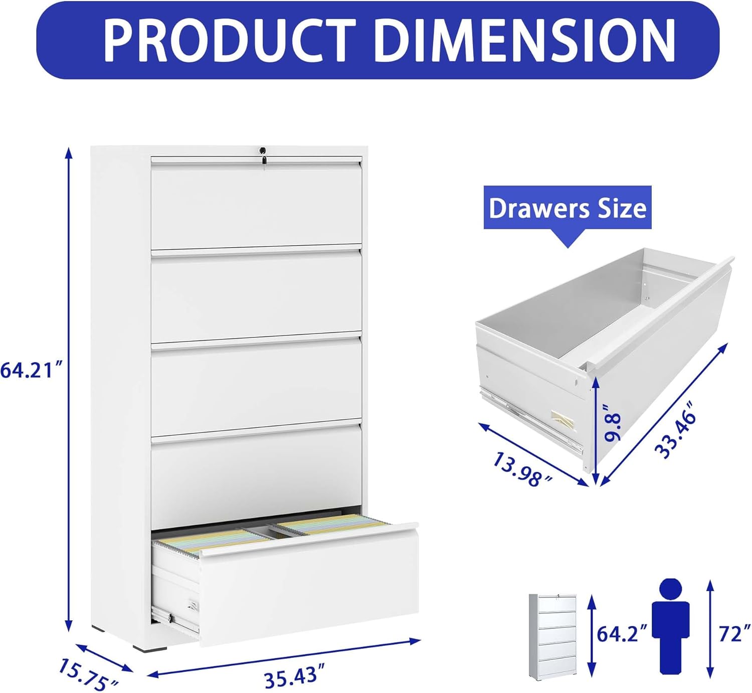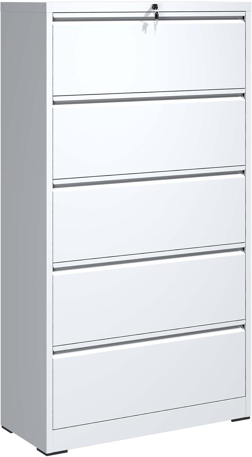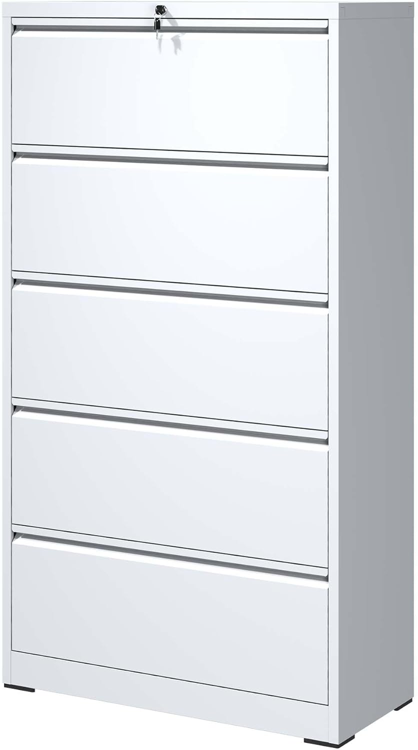 5 Drawer Metal Lateral File Cabinet, White Filing Cabinet with Lock, Lockable File Cabinet for Home Office, Locking Metal File Cabinet for Legal/Letter/A4/F4 Size