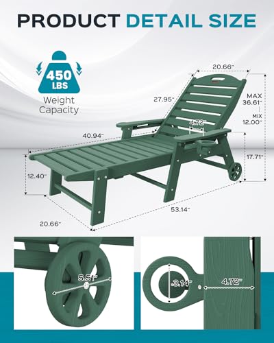 Chaise Lounge Chair Outdoor with Wheels, Wood Texture Adjustable 5-Position Chaise Lounge Outdoor, Patio Lounge Chair for Poolside Backyard, Black, Large