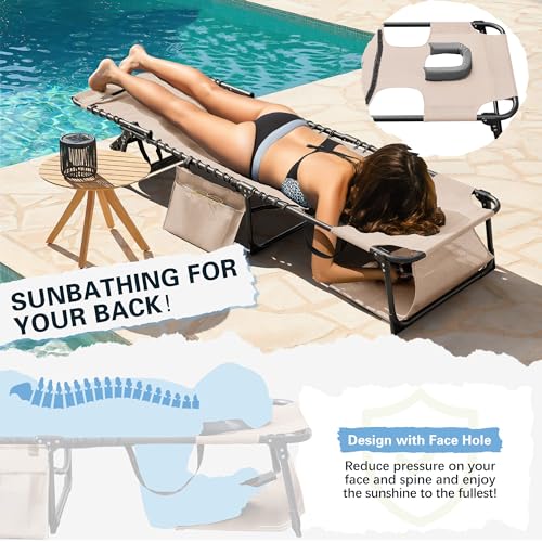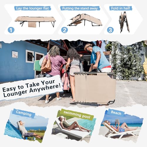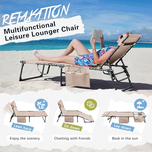 Greesum Chaise Lounge Folding Tanning Chair with 5 Position Adjustable Back, Detachable Pillow & Pocket Outside Pool, Beach, Sunbathing, Black