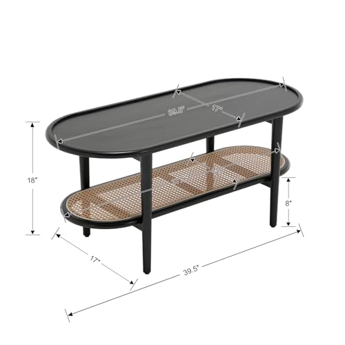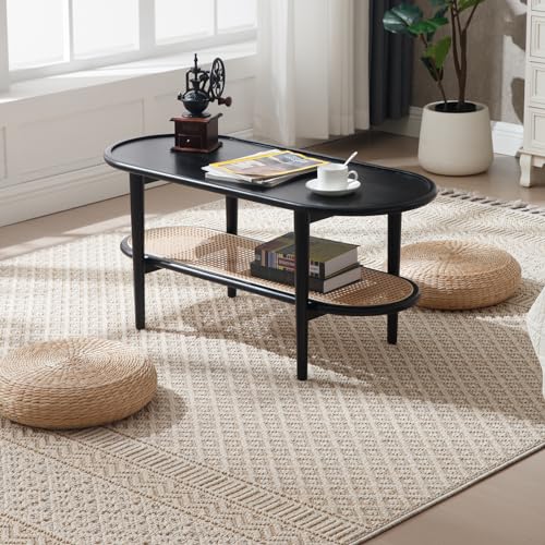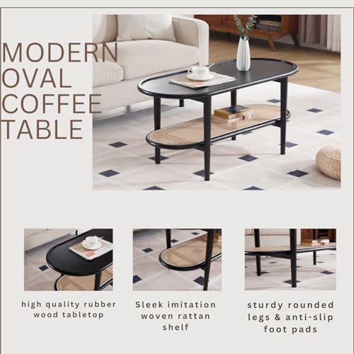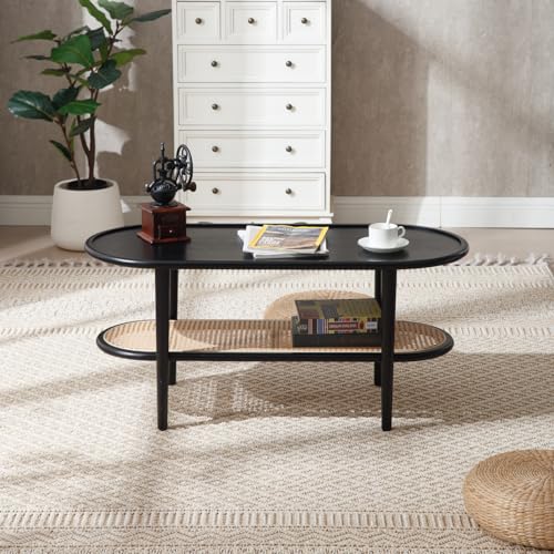 ZSARTS Rattan Coffee Table, 2-Tier Wood Center Table with Open Storage Shelf, Oval Tea/Side/Sofa Table for Living/Meeting Room,Bedroom, Office, Apartment, Small Spaces, Walnut
