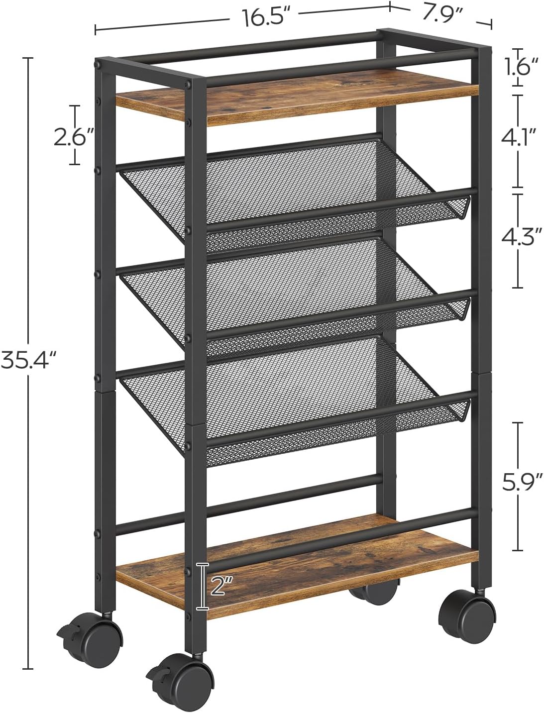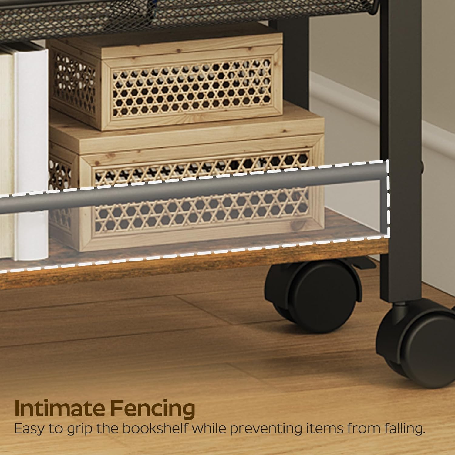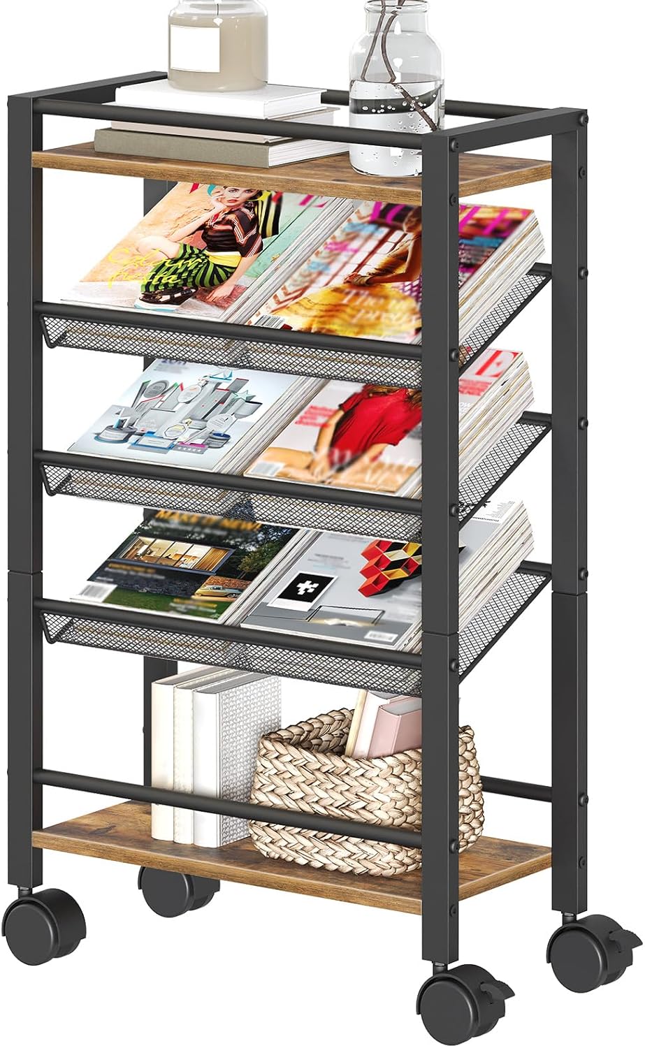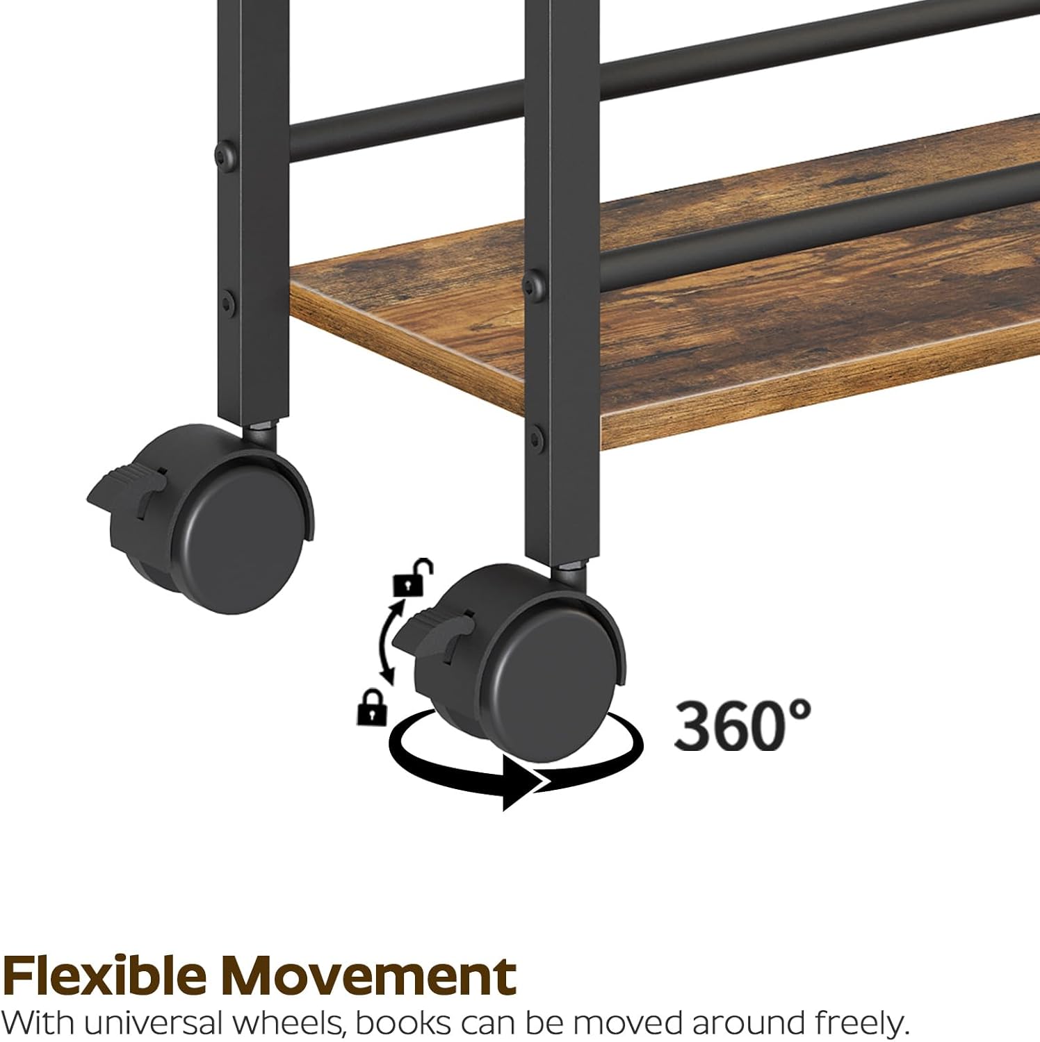 5 Tier Bookshelf, Metal Small Industrial Bookcase, Mobile Book Shelf Paper Cart with Wheels, Book Case Display Storage Shelf Organizer for Living Room, Home Office, Rustic Brown SJ01BR