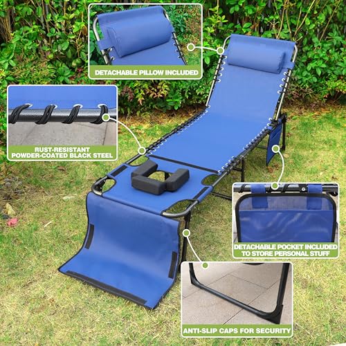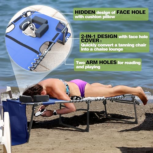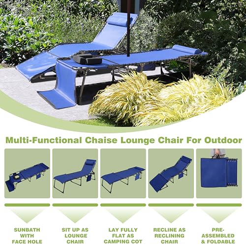 Foldable Chaise Lounge Chair with Face Hole, Outdoor Portable Tanning Chair with 5 Position Adjustable Back, Detachable Pillow & Pocket, Patio, Beach and Pool, Black