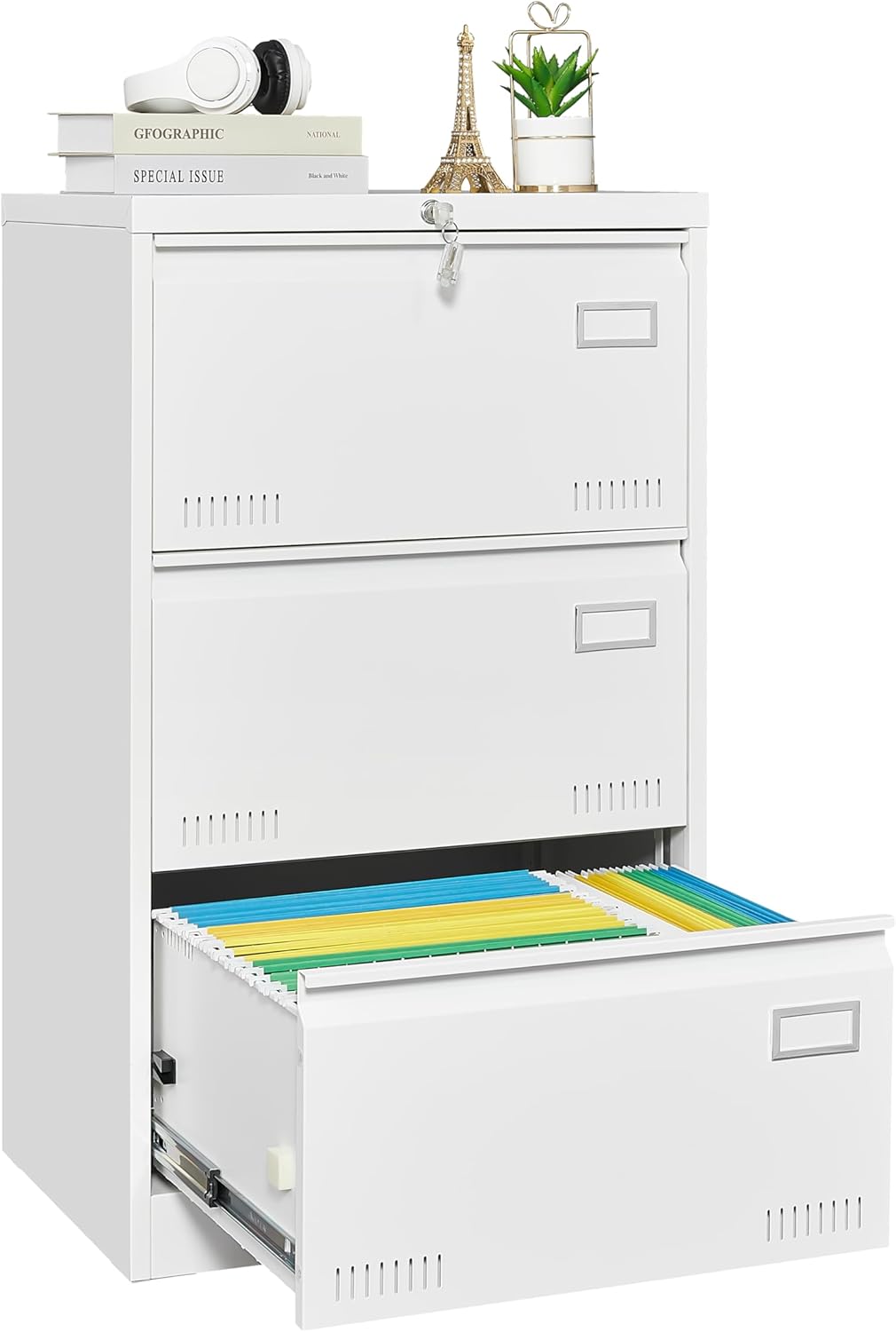 Lockable 3-Drawer Metal File Cabinet Lateral Office Storage Organizer, Legal/Letter/A4 Sizes Metal Cabinet Lock Black/Black & White/White (White)