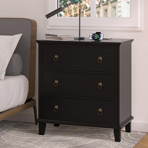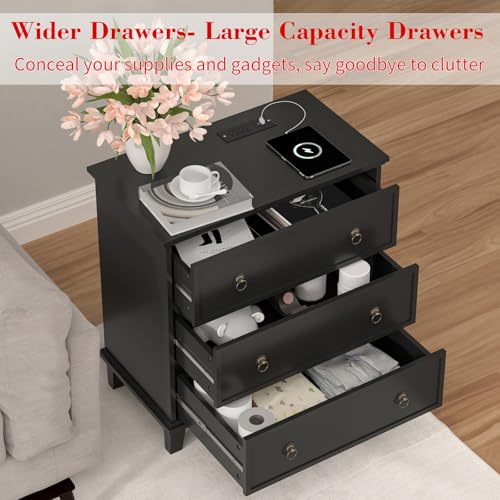 27.6 Inch Wide Nightstand Set of 2 with Charging Station, 3 Drawers Nightstand for Bedroom, Wooden Black Large Bedside End Table for Living Room, Bedroom, Study, Office