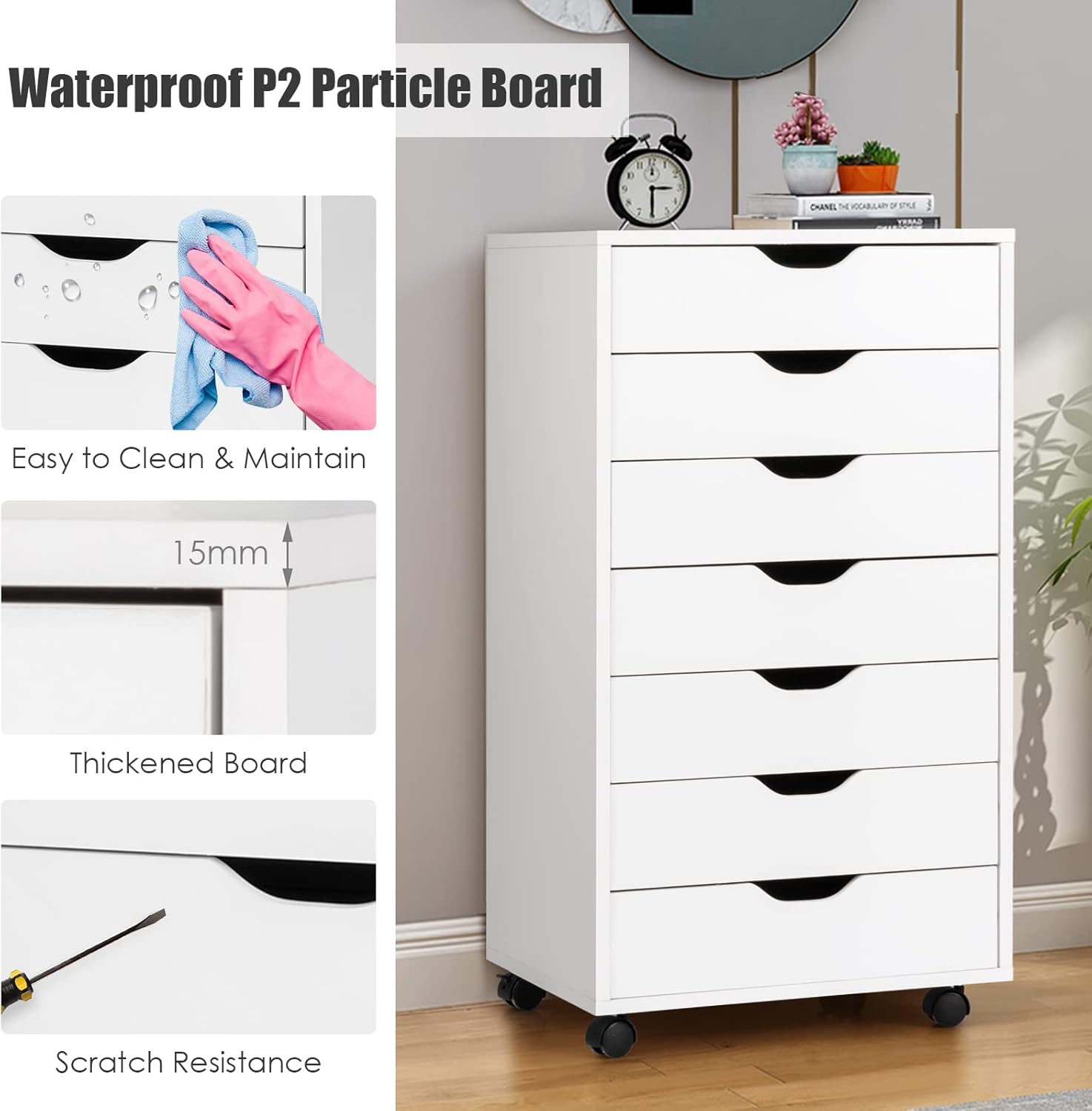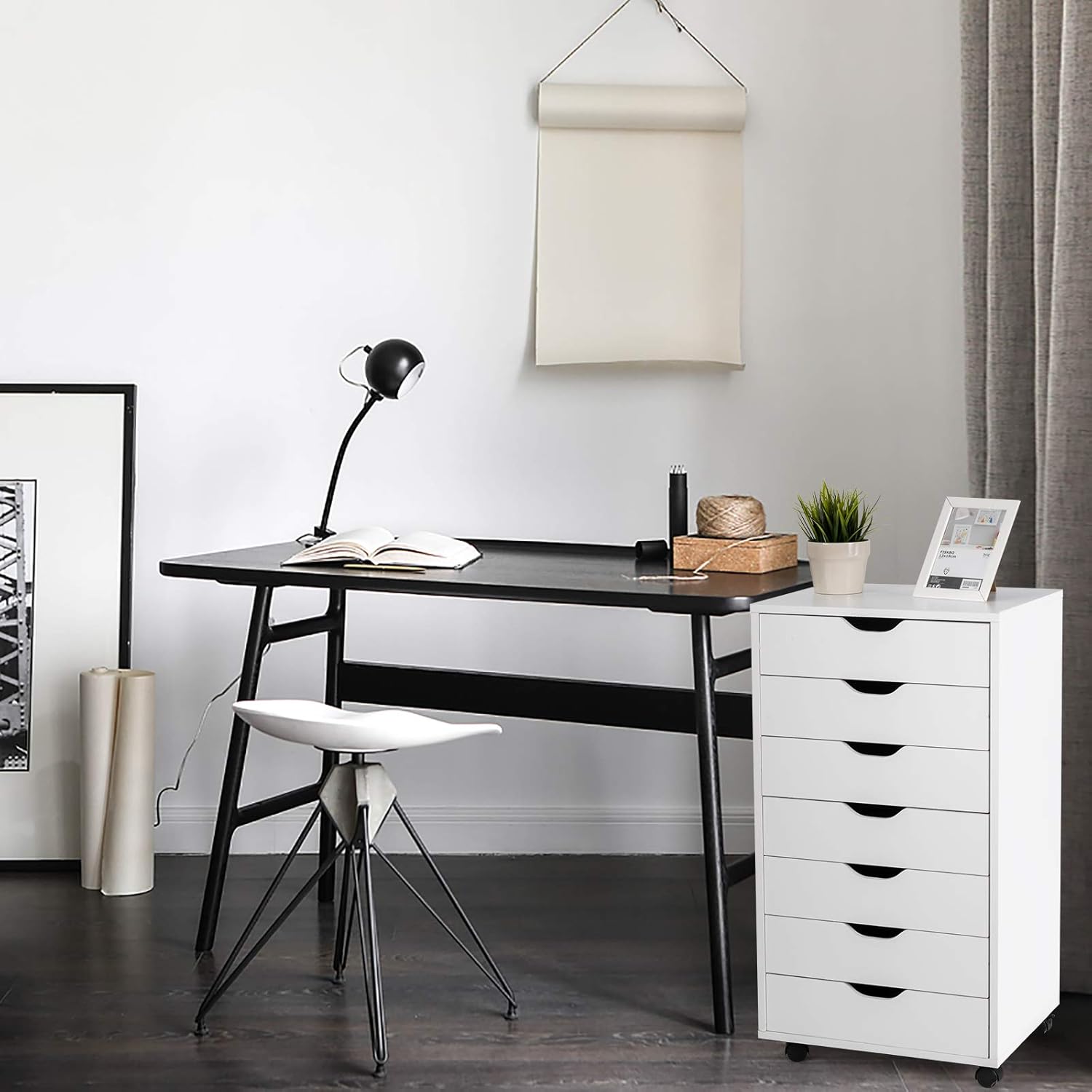 7 Drawers File Cabinet, 34.5”Vertical Filing Cabinet for Home Office, Under Desk Storage Cabinet with Wheels, Mobile Chest of Drawers, Lateral Rolling Printer Stand, White