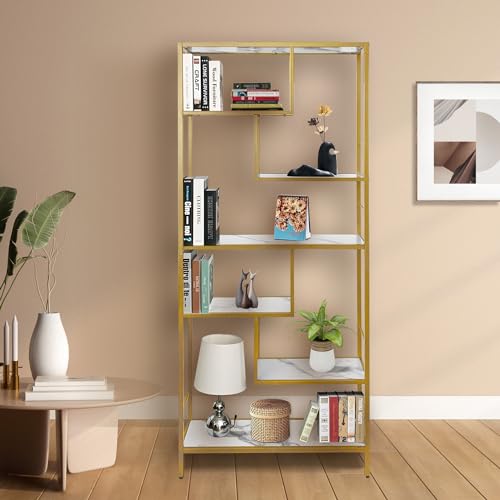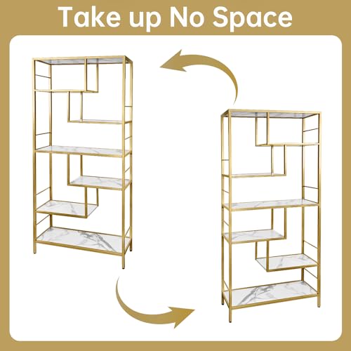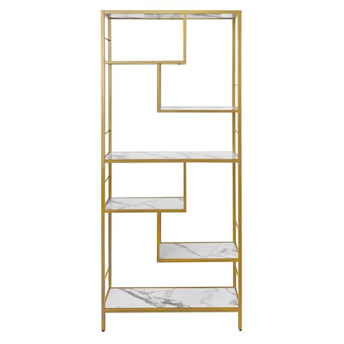 AT-VALY 6 Tier Bookcase Bookshelf, 72.4”Tall Modern Freestanding Bookshelf with 6 Shelves, Faux Marble Open Display Storage Book Shelves for Living Room Bedroom Home Office (Gold)