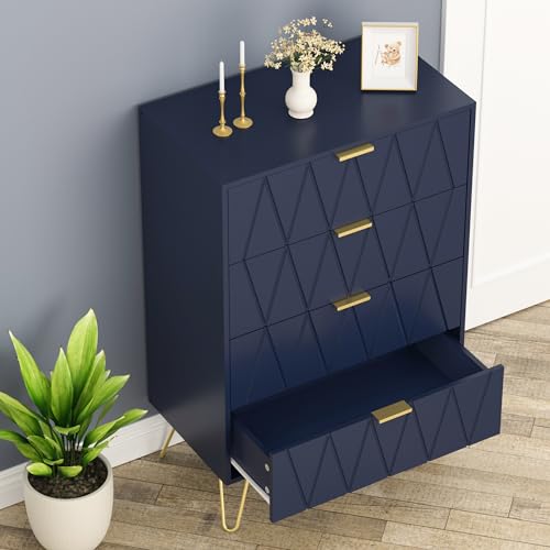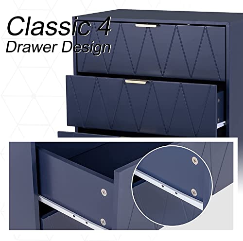 Grooved Pattern 4 Drawer Dresser,Modern Chest of Drawers with Gold Handles,Navy Blue Dresser for Bedroom,Living Room,Entryway