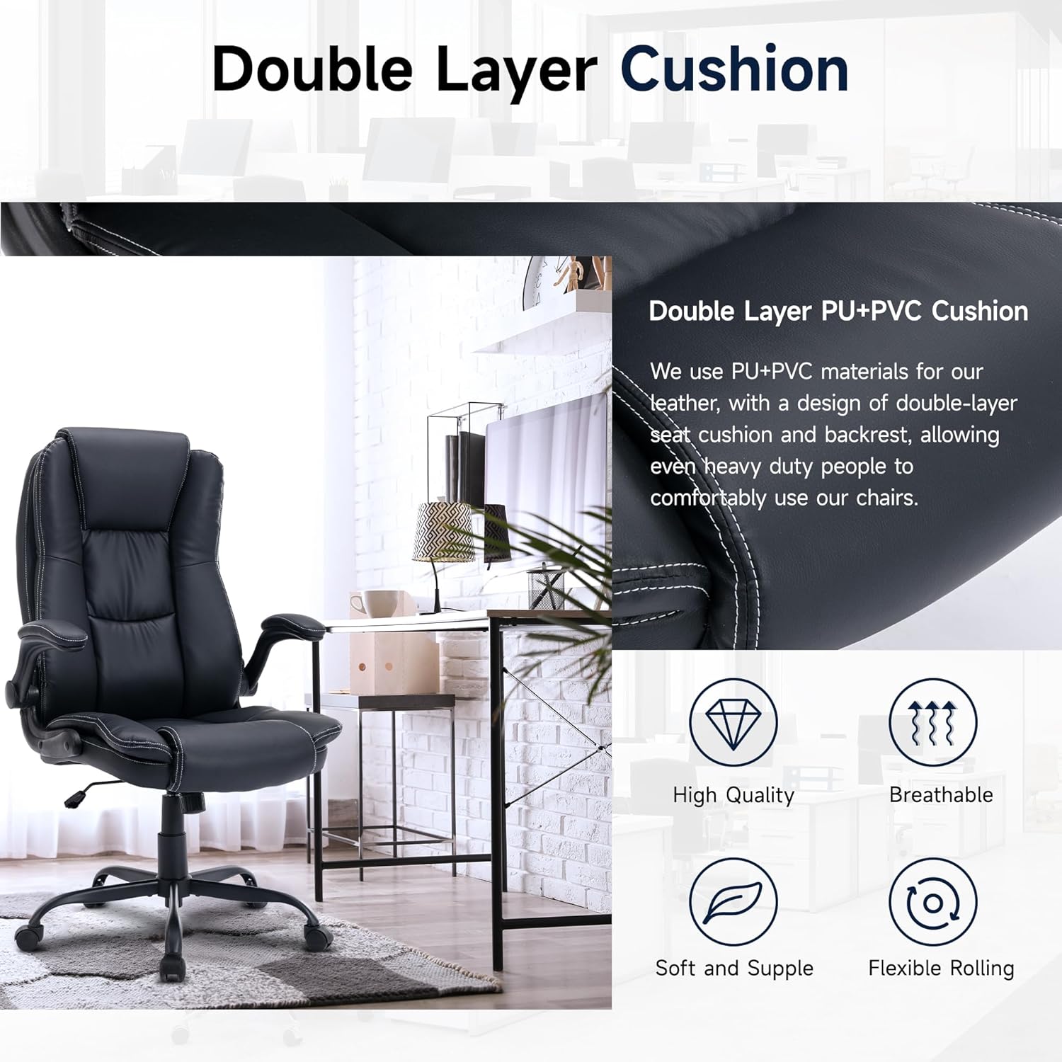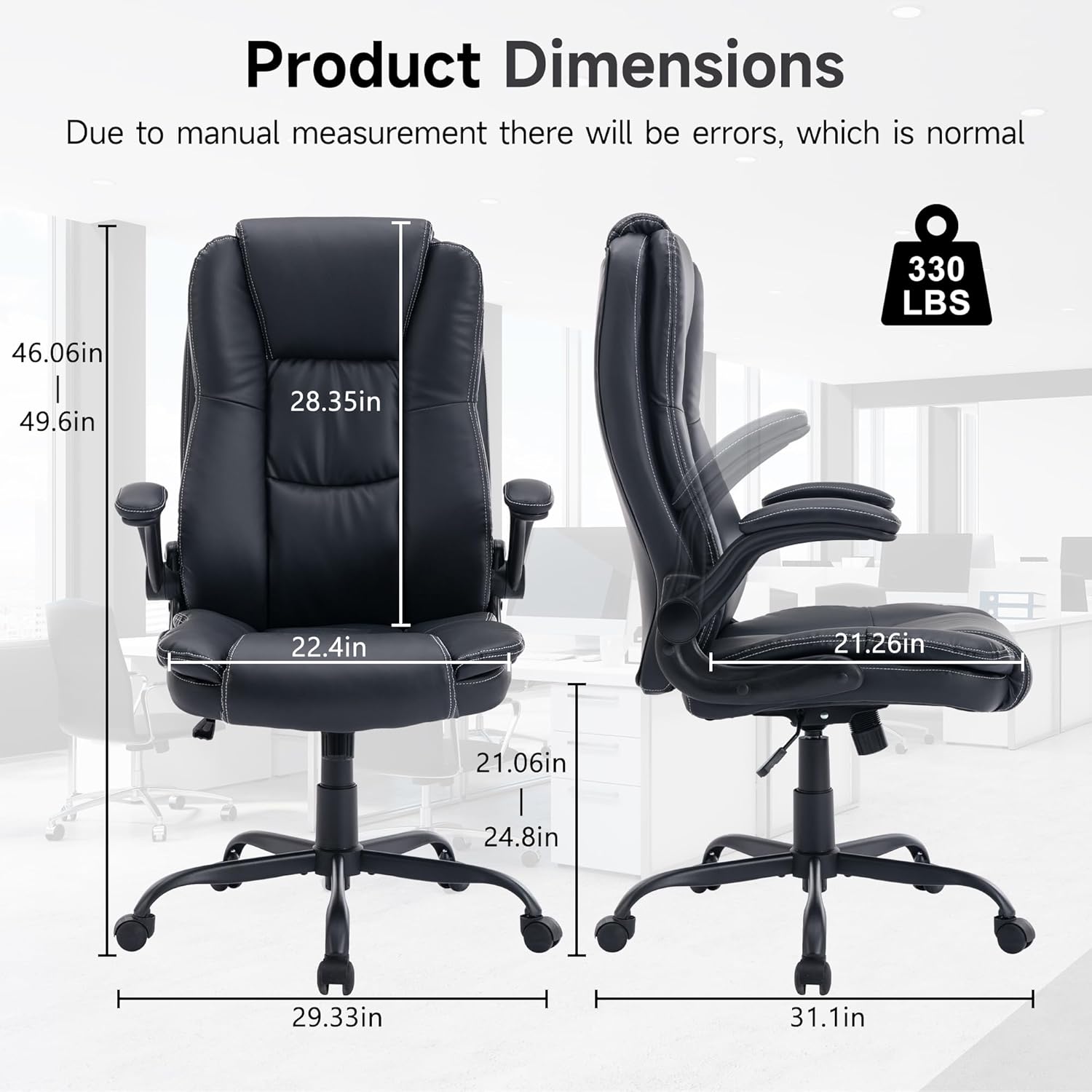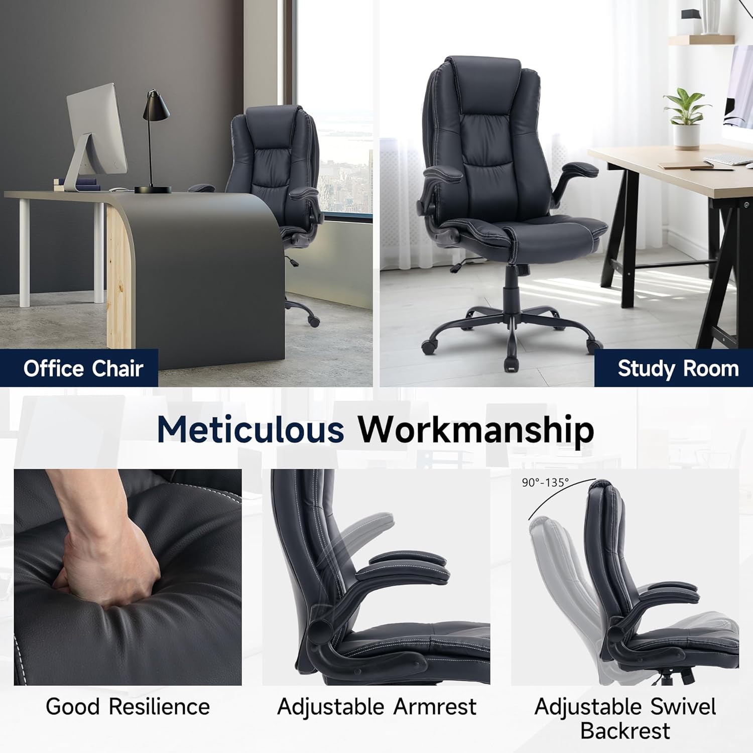 Big and Tall Office Chair,High Back Executive Office Chair with Flip-up Armrest,PU Leather Ergonomic Office Chair with Back Lumbar Support,Swivel Rolling Desk Chair with Wheels(Black)