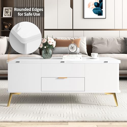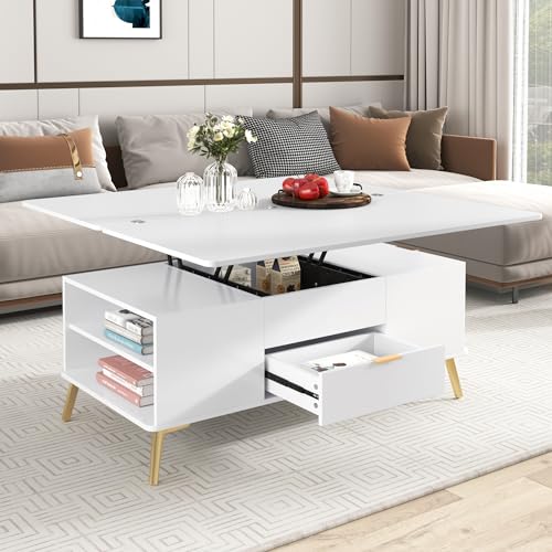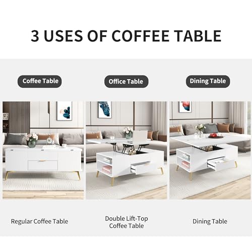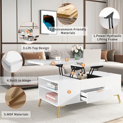 Lift Top Coffee Table, 3 in 1 Lift-Top Design Coffee Table with Open Shelves, Modern Center Tables for Living Room, Home, Office, Rustic Ivory