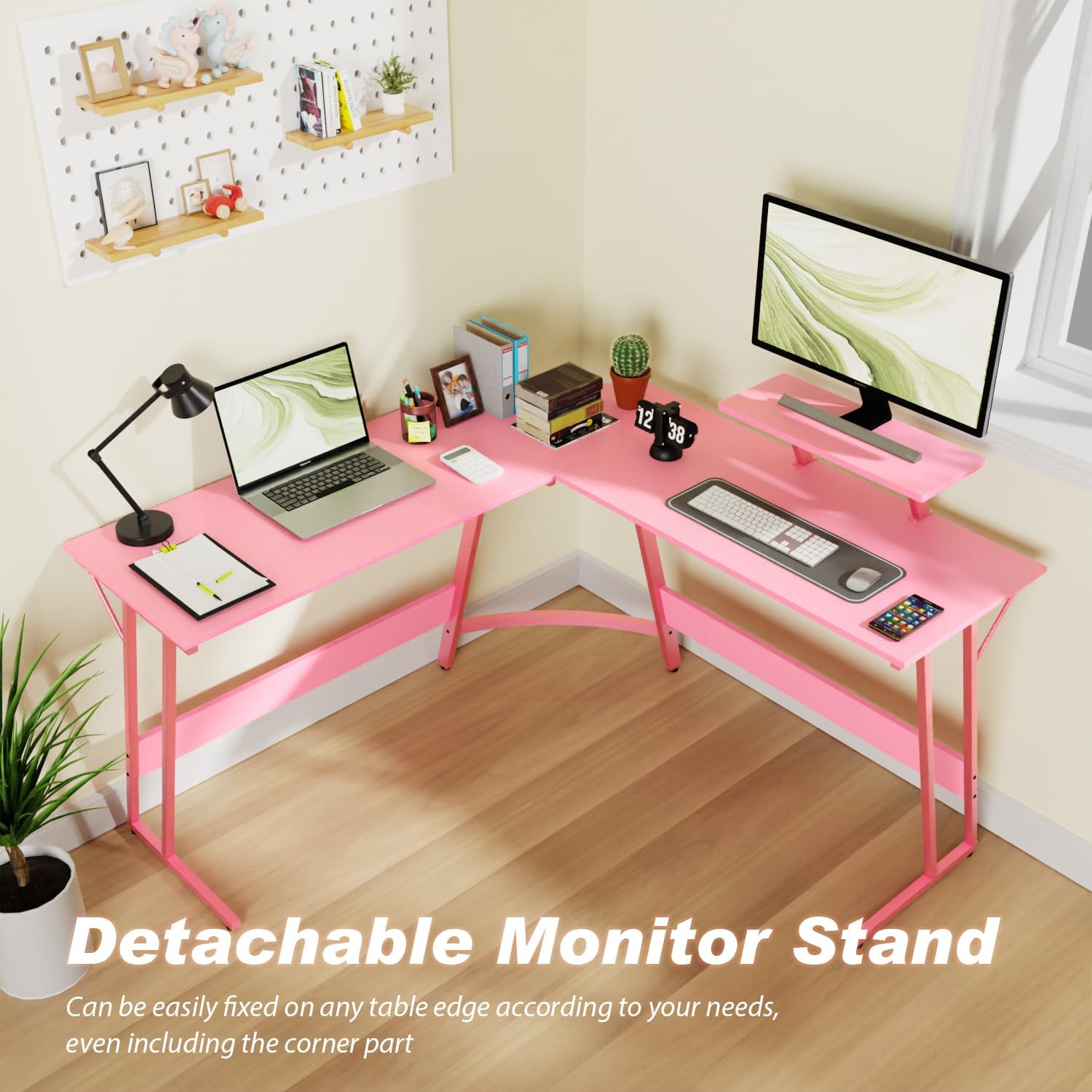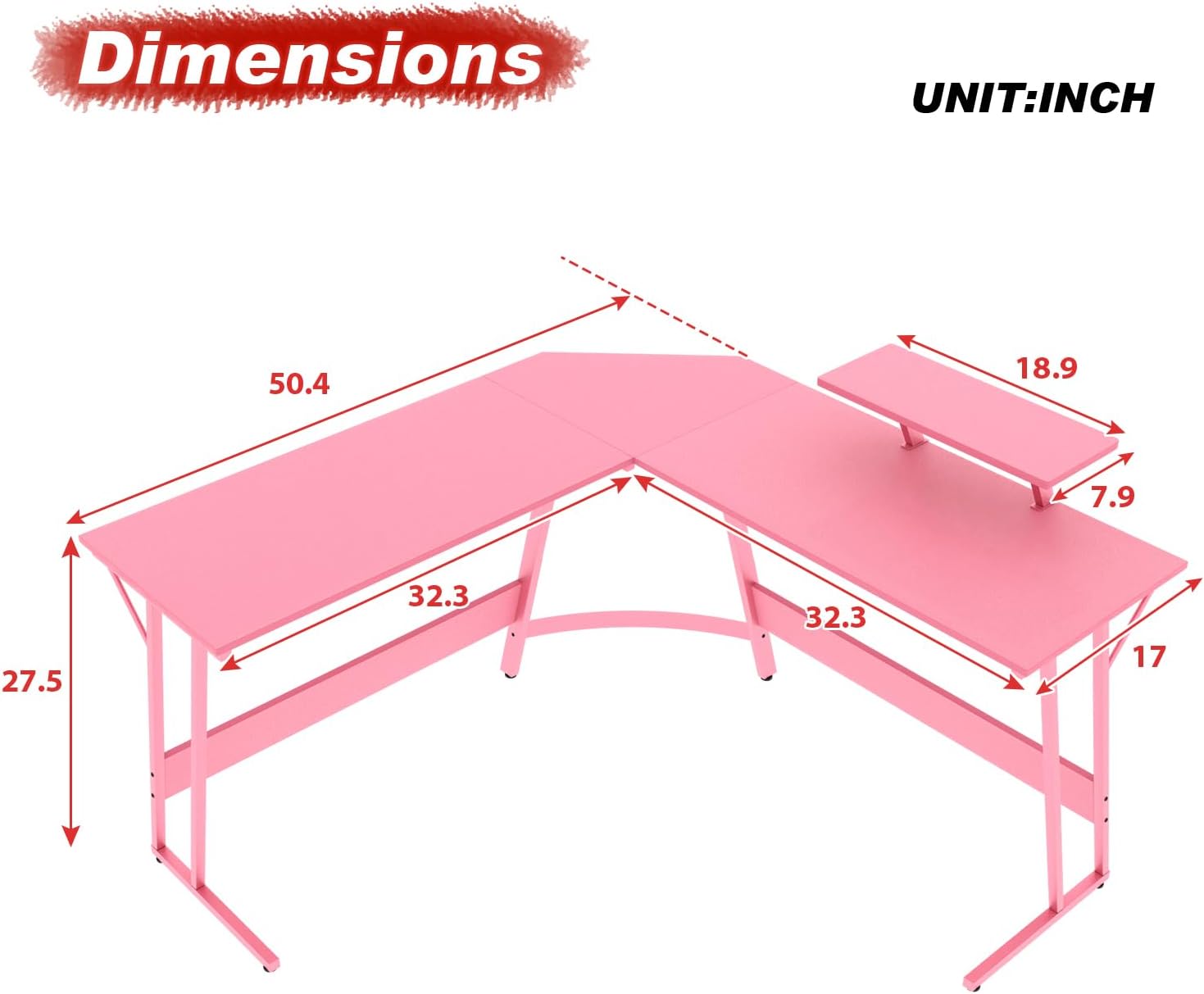 L Shaped Desk 50.4 Inch Corner Desk Gaming Desk Computer Desk with Large Desktop,Monitor Stand,Foot Peg Gaming Table Computer Table Space Saving Easy Assembly for Home,Office,Work,Gaming,Pink