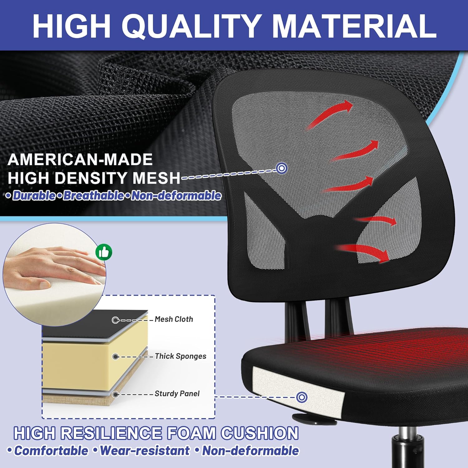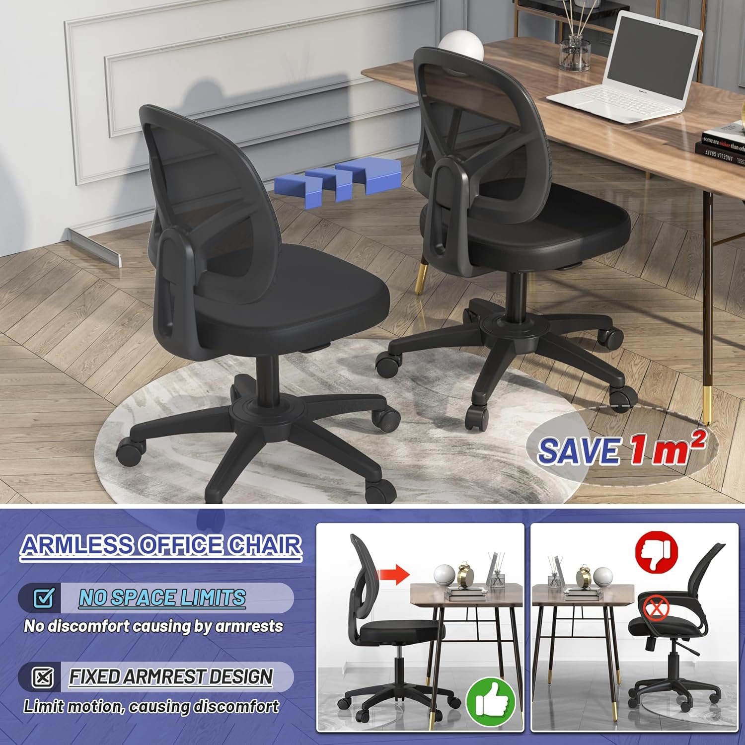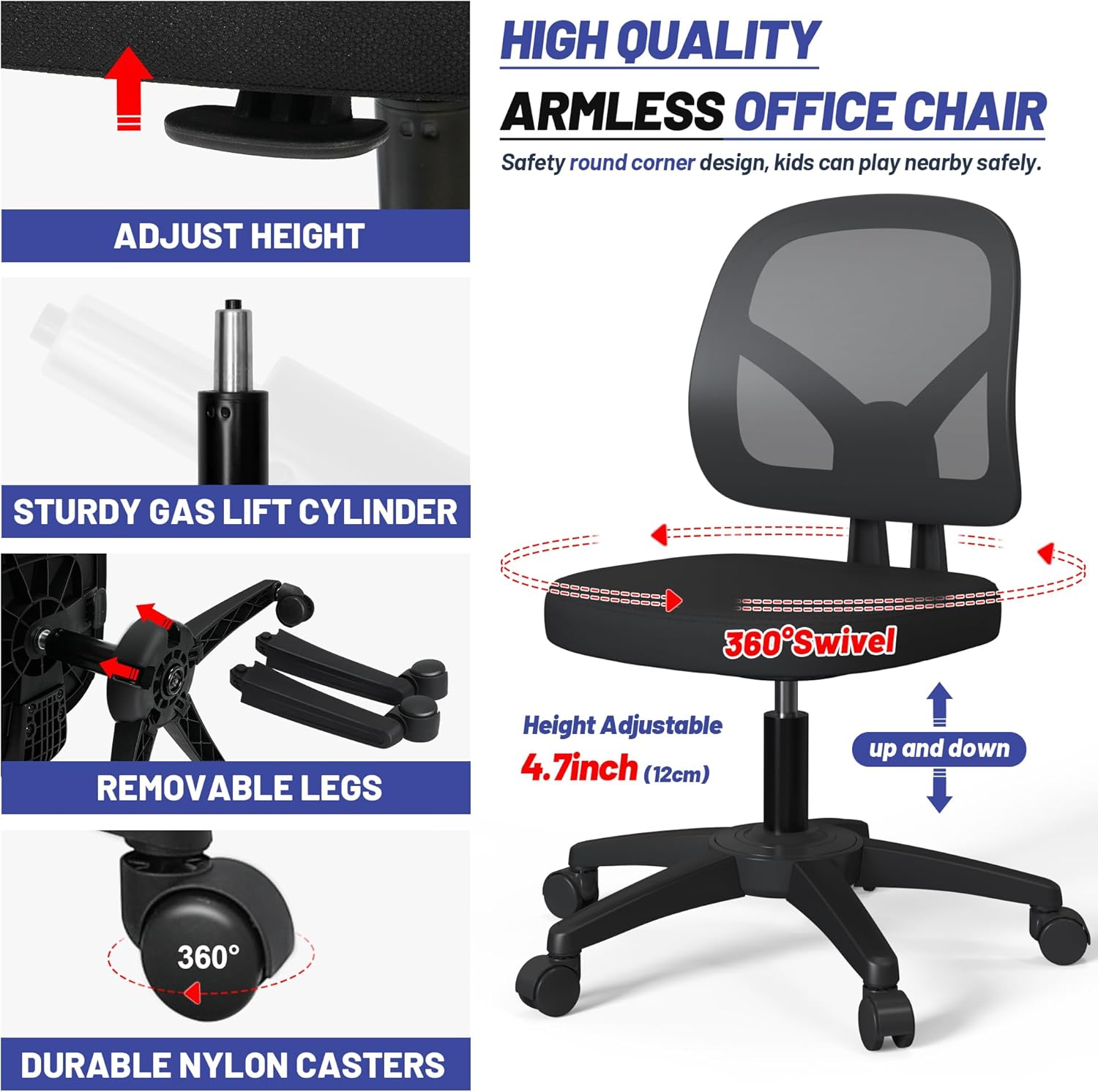 Swivel Modern Low Home Computer Office Desk Chair with Wheels No Arms for Adult Study and Work, Mesh Back, Black
