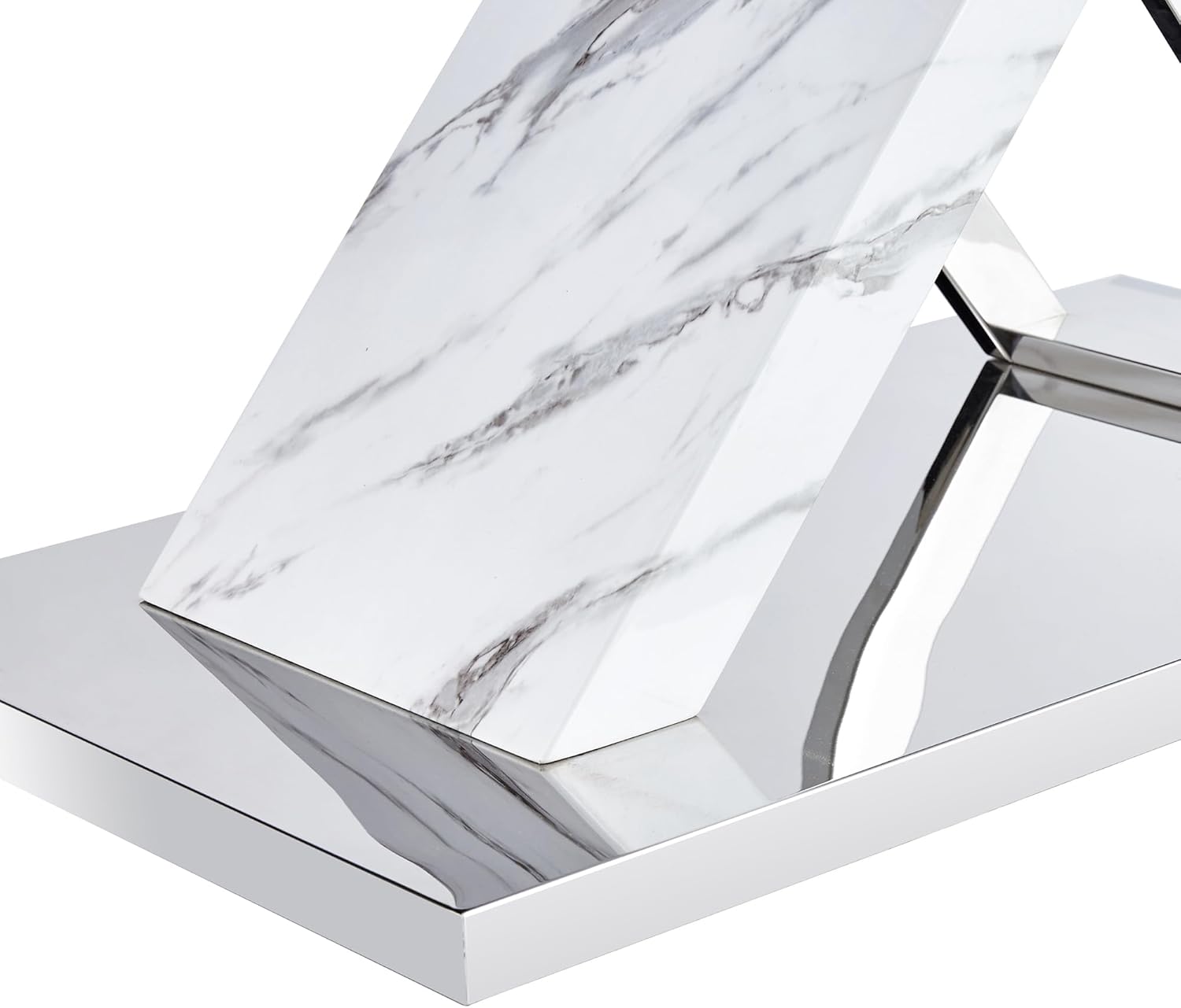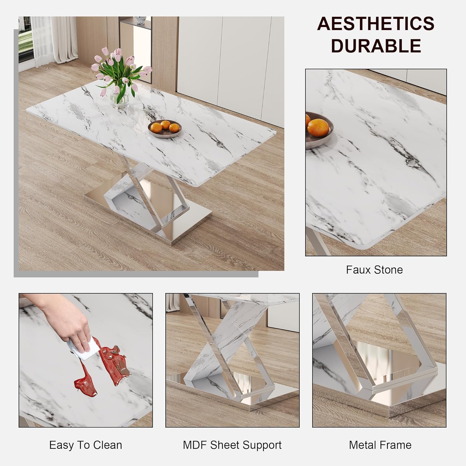 SSLine Modern 5-Piece Faux Marble Dining Table Set for 4, 63" White Marble Kitchen Table with 4 Black Leather Dining Chairs Elegant Dining Room Table Set with Silver Metal Base for Home Kitchen