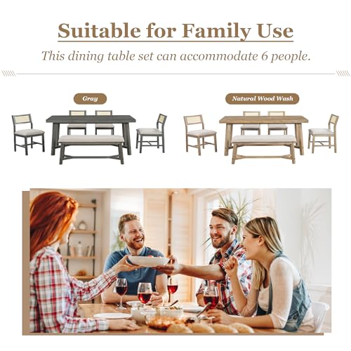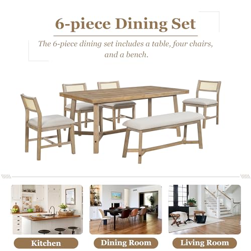 Harper & Bright Designs TREXM 6-Piece Retro Farmhouse Style Dining Set, Rectangular Table and 4 Upholstered Chairs with Rattan and Bench for Dining Room and Kitchen (Natural Wood Wash)