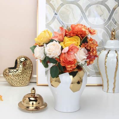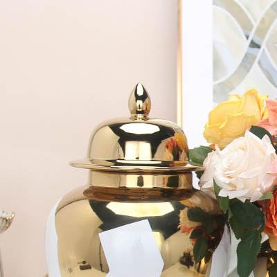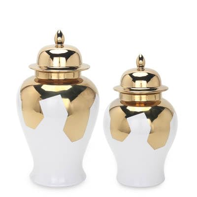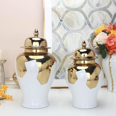 Gold Ginger Jar/White with Lid/Ceramic VASE or Flower vase for Home Decor/living room decor/kitchen decor/ginger jar Geometric shape (SMALL 14"H)