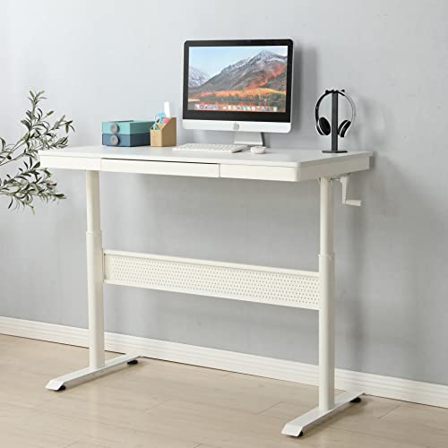 Adjustable Height Office Desk with Drawer, 48 x 24 Inches Standing Desk with Tempered Glass and Metal Steel Frame, 4 Adjustment Systems Sit Stand Home Office Desk, Easy Assembly