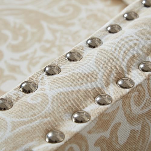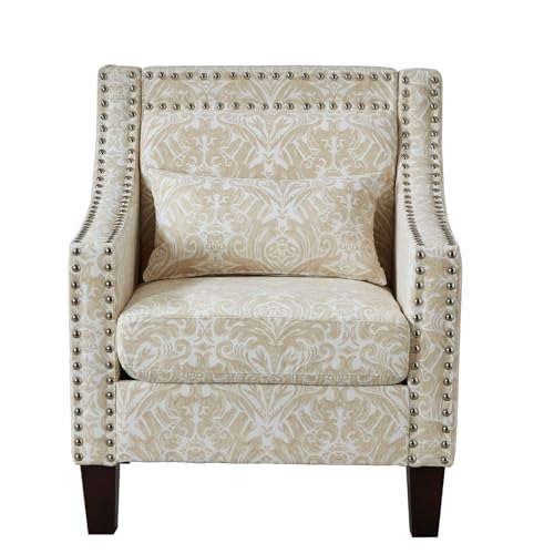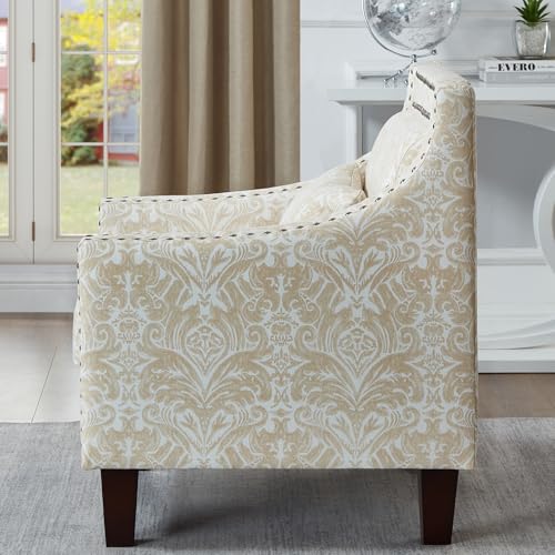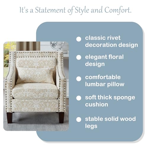 Mid Century Modern Floral Accent Chair, Beige Living Room Chair with Wooden Legs, Patterned Corner Chair with Arm, Side Chairs for Bedroom, Office, Rivet Decorative Armchair with Lumbar Pillow